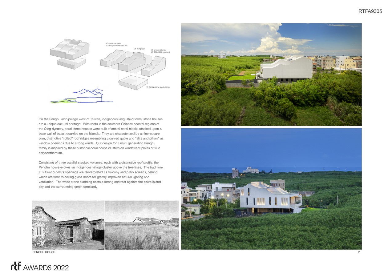 On the Penghu archipelago west of Taiwan, indigenous laogushi or coral stone houses are a unique cultural heritage. With roots in the southern Chinese coastal regions of the Qing dynasty, coral stone houses were built of actual coral blocks stacked upon a base wall of basalt quarried on the islands. They are characterized by a nine-square plan, distinctive “rolled” roof ridges resembling a curved gable and “slits and pillars” as window openings due to strong winds. Our design for a multi generation Penghu family is inspired by these historical coral house clusters on windswept plains of wild chrysanthemum.