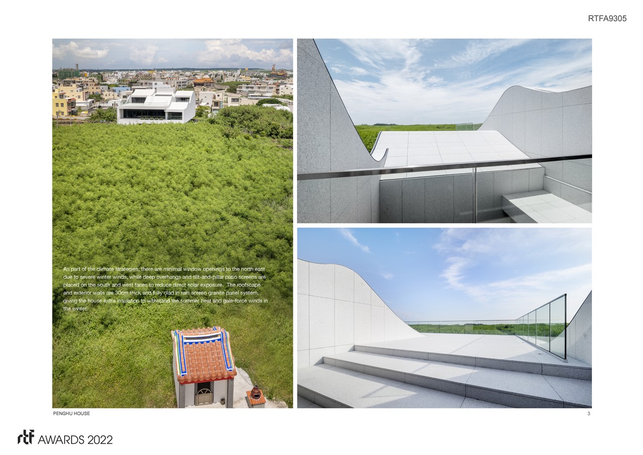 Consisting of three parallel stacked volumes, each with a distinctive roof profile, the Penghu house evokes an indigenous village cluster above the tree lines. The traditional slits-and-pillars openings are reinterpreted as balcony and patio screens, behind which are floor to ceiling glass doors for greatly improved natural lighting and ventilation. The white stone cladding casts a strong contrast against the azure island sky and the surrounding green farmland.