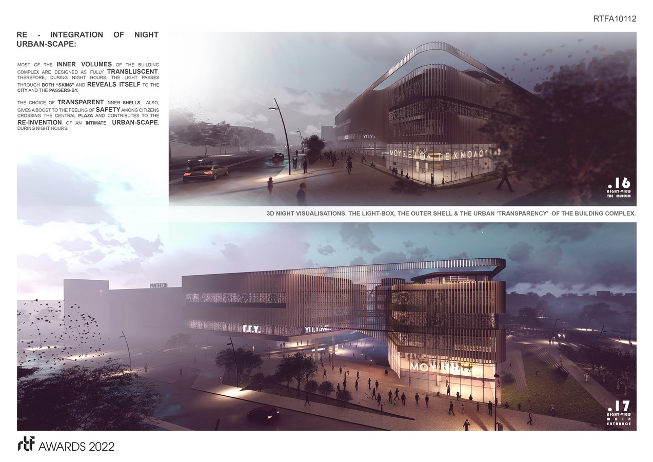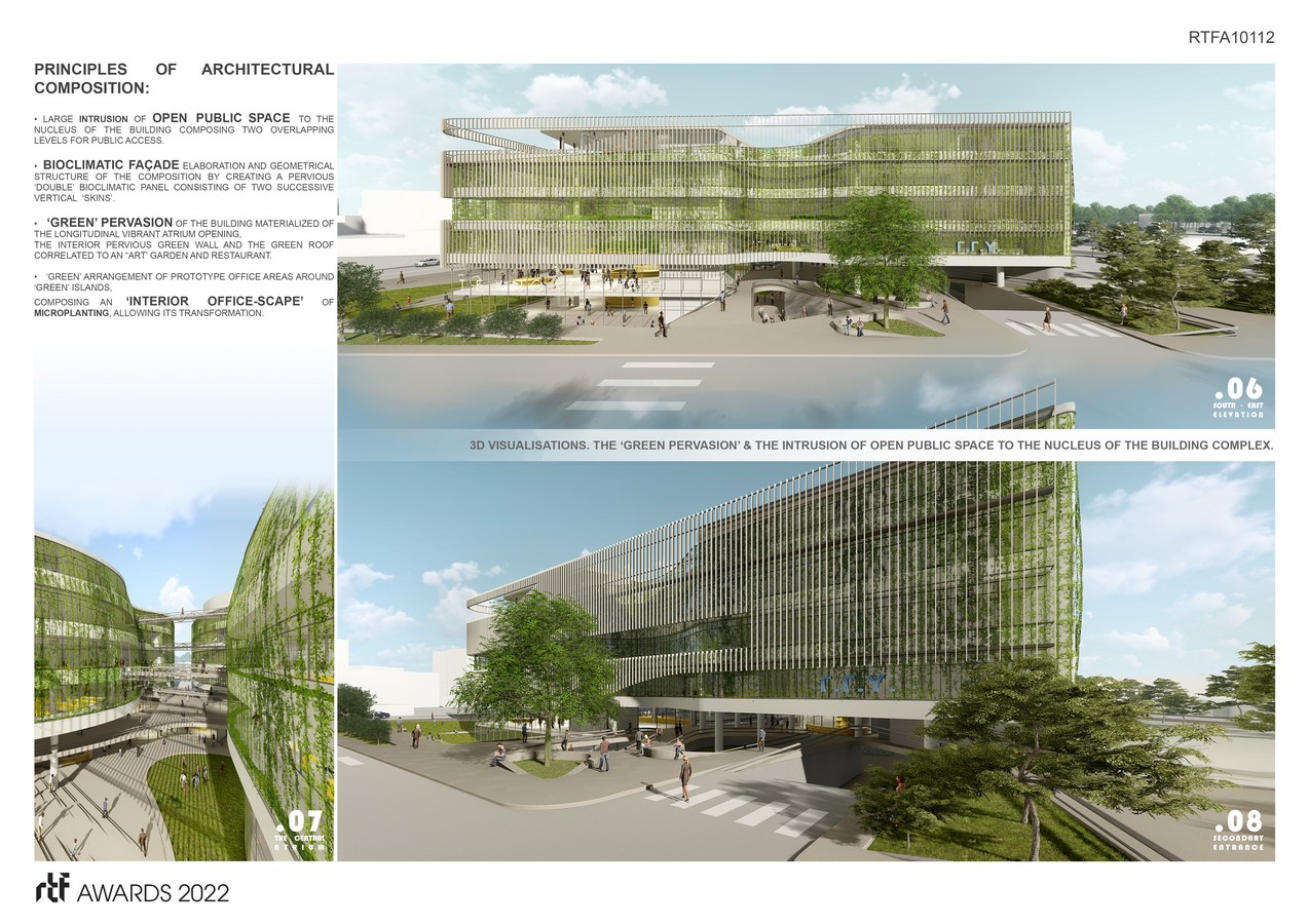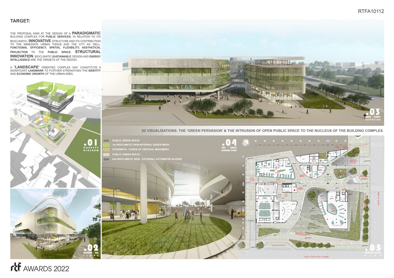 The proposal aims at the design of a paradigmatic building complex for public services, in relation to its bioclimatic, innovative structure and its contribution to the immediate urban tissue. Functional efficiency, spatial flexibility, aesthetical projection to the public space, structural innovation, bioclimatic sustainable design and energy intelligence are the targets of the design. The proposal of a ‘Landscape’ oriented complex may constitute a significant landmark to further strengthen the identity and economic growth of the urban area.
