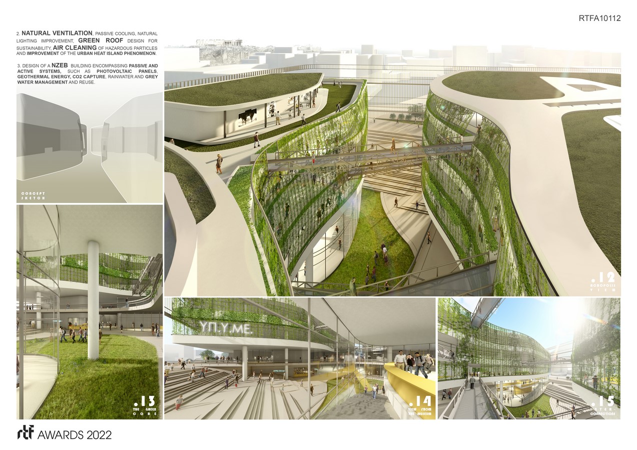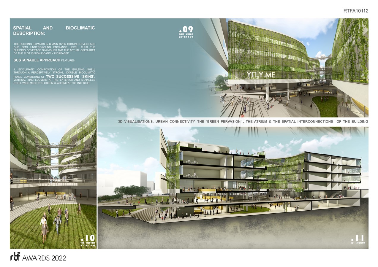 - ‘green’ pervasion of the building materialized of the longitudinal vibrant atrium opening, the interior pervious green wall and the green roof correlated to an “art’ garden and restaurant.