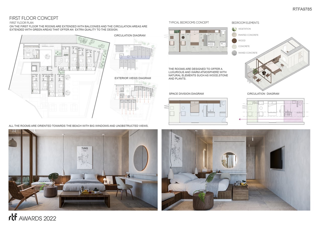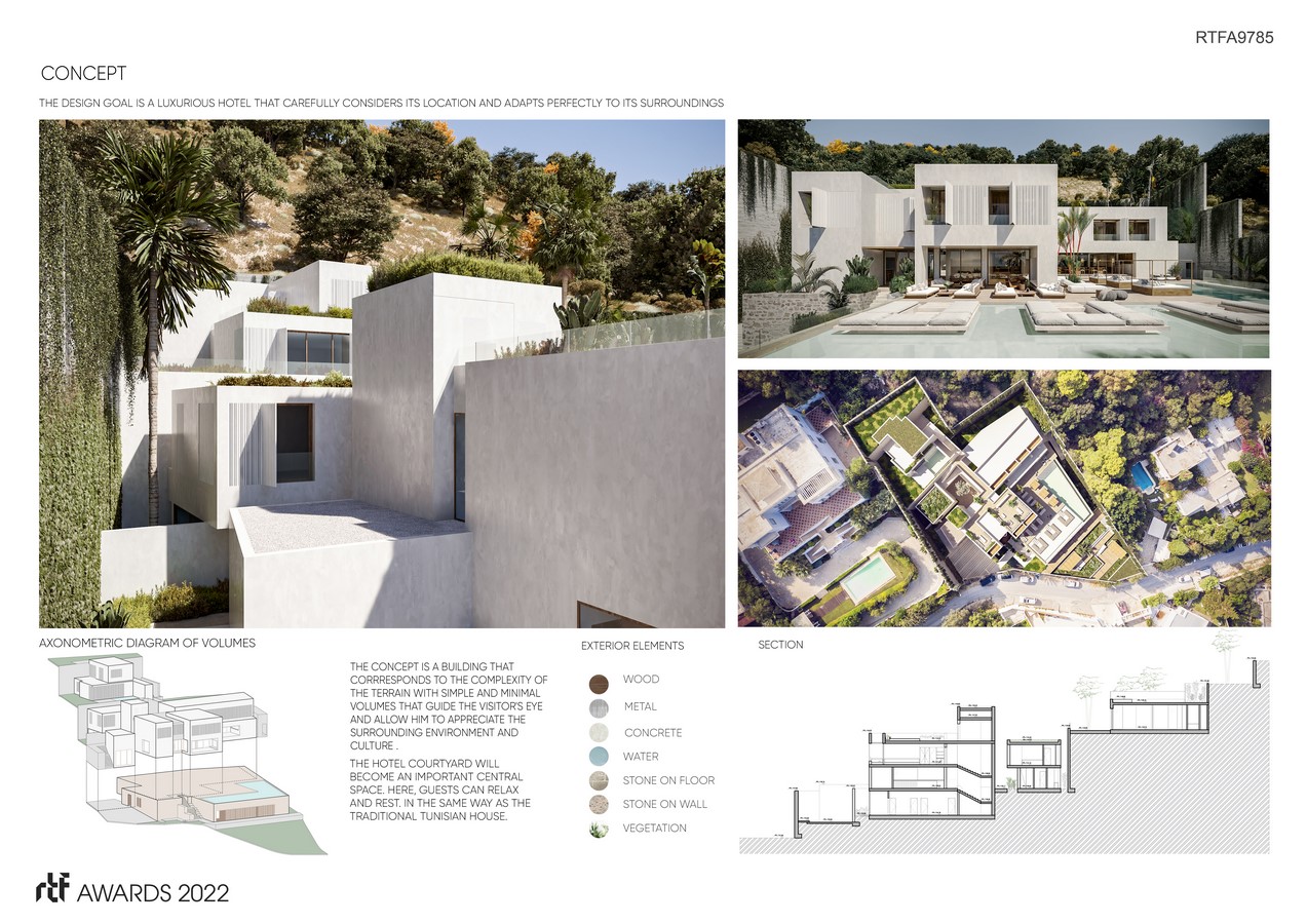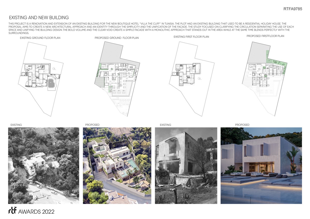 This project is a renovation and extension of an existing building for the new boutique hotel ‘’Villa the cliff’’ in Tunisia. The plot had an existing building that used to be a residential holiday house. The proposal aims to create a new architectural approach and an identity through the simplicity and the unification of the facade. The study focused on clarifying the circulation separating the use of each space and unifying the building design .The bold volume and the clear void create a simple facade with a monolithic approach that stands out in the area while at the same time blends perfectly with the surroundings.