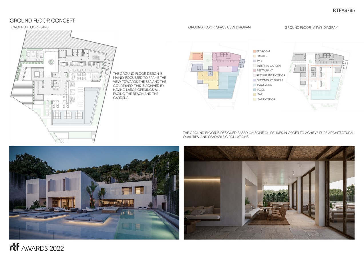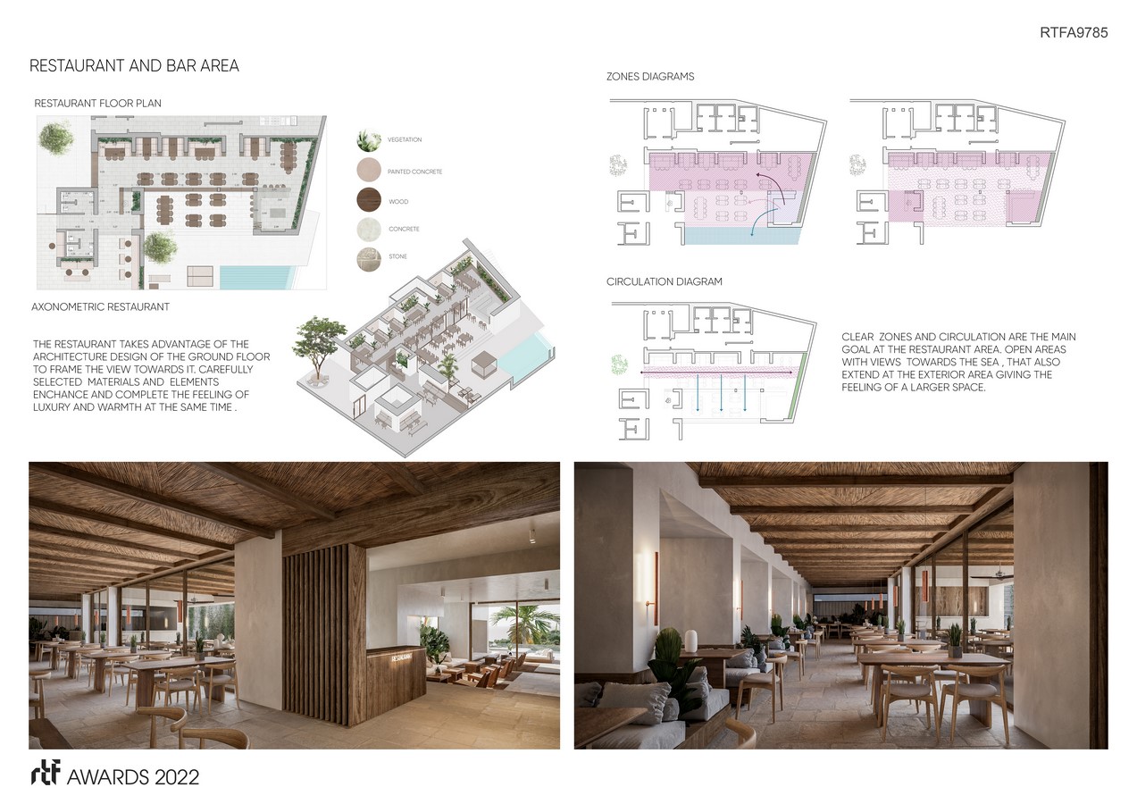 The ground floor is designed with a clear diagram and two main axis in order to frame the view towards the sea and the courtyard. Some parts of the program, like the restaurant and the lounge-bar have outdoor areas that allow the ground floor to be extended towards the outdoor area giving the sense of a larger space.