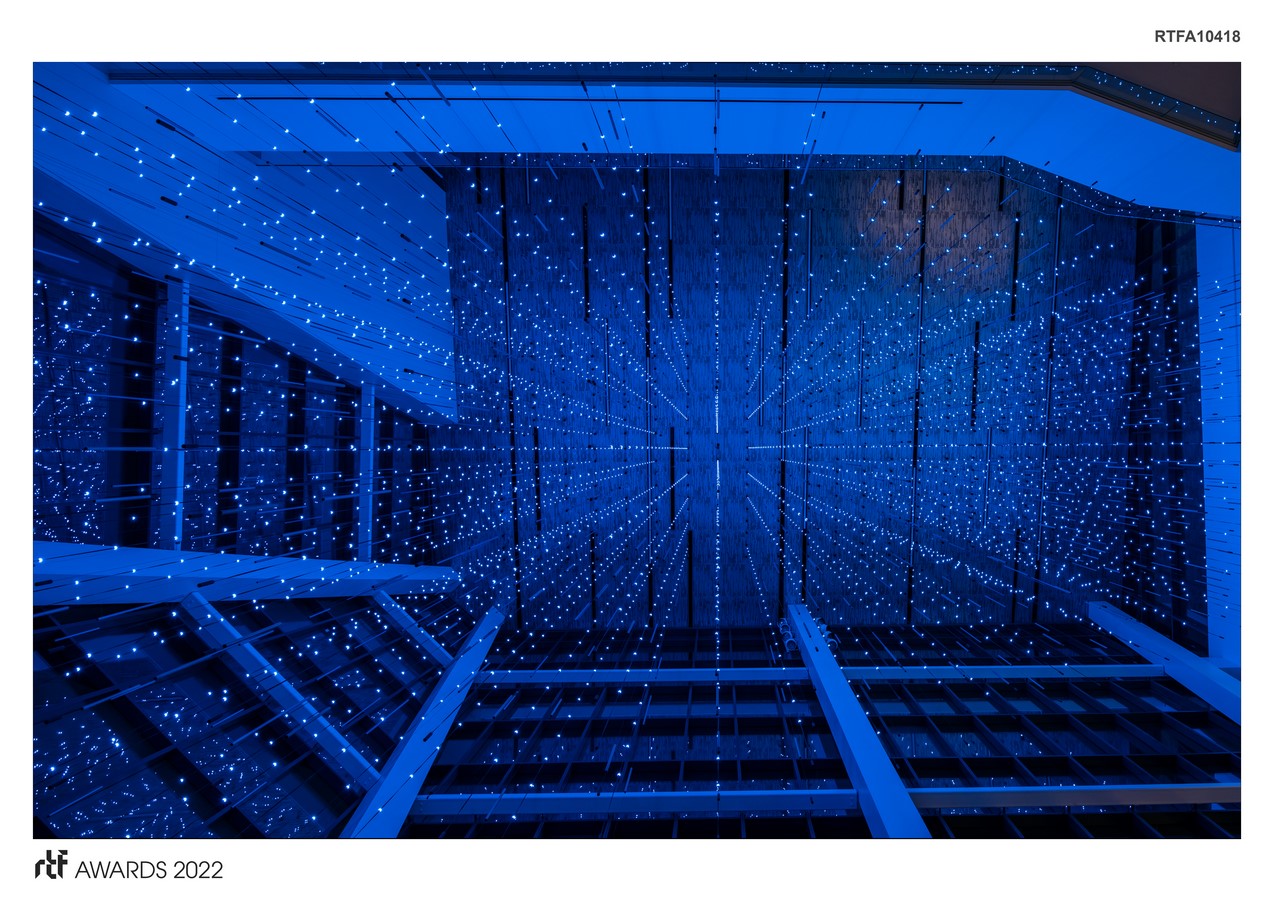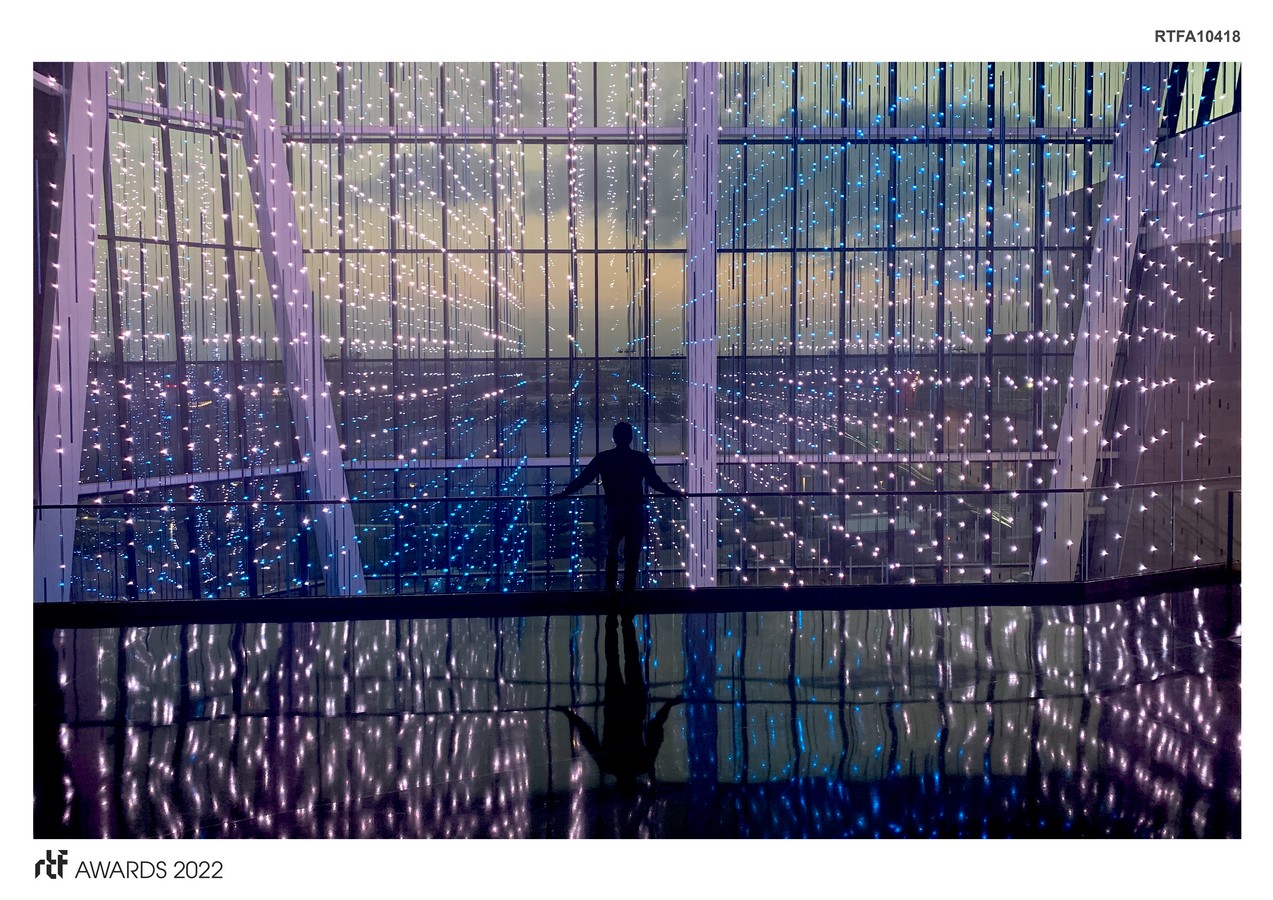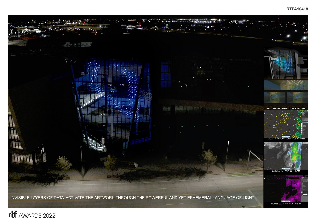 The suspended structure spans the two glass public atriums. Within each, anodized titanium forms create an environment inspired by the sky’s movement. Their reflective surfaces respond to light and shadow from the surrounding environment. The palette evokes the subtle shifts of color one experiences throughout the day and throughout the season. Within this field of color, a grid of 60,000 points of light connected to a stream of Oklahoma City Data Portals trace weather patterns in realtime. Together, the suspended titanium and light structure creates an immersive visual experience, a digital simulacra that parallels the complexity of the ongoing natural phenomena of the vast, changeable, majestic sky that is so much a part of this city.