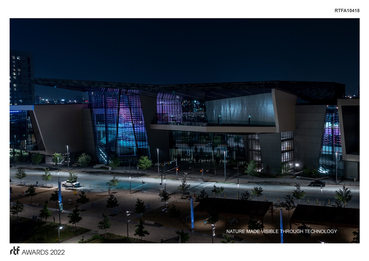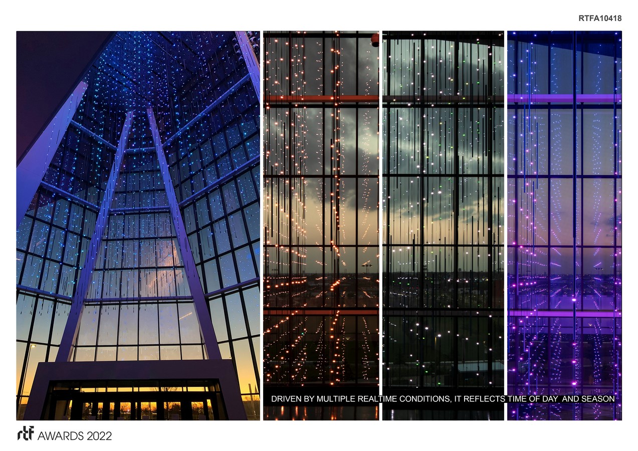In the evening, the animated movement of color is experienced from within the Convention Center, from the downtown streetscape and from the large park beyond. The region’s invisible layers of data become the means to activate the public spaces through the powerful and yet ephemeral language of light. This project seeks to give that shared experience a new expression, to create a new common language for this city on a plain under a vast sky.