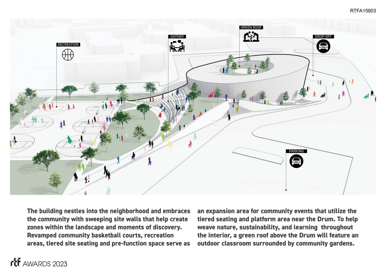 The western portion of the site is home to the revamped community basketball courts and recreation area, in addition to tiered site seating and pre-function space. In the spirit of flexibility, the basketball courts and recreation area will also serve as an expansion area for community events. The sweeping site walls help create zones within the site and moments of discovery. Topped with a green roof, the Drum will have an outdoor space that is an expression of nature, sustainability, and learning.
