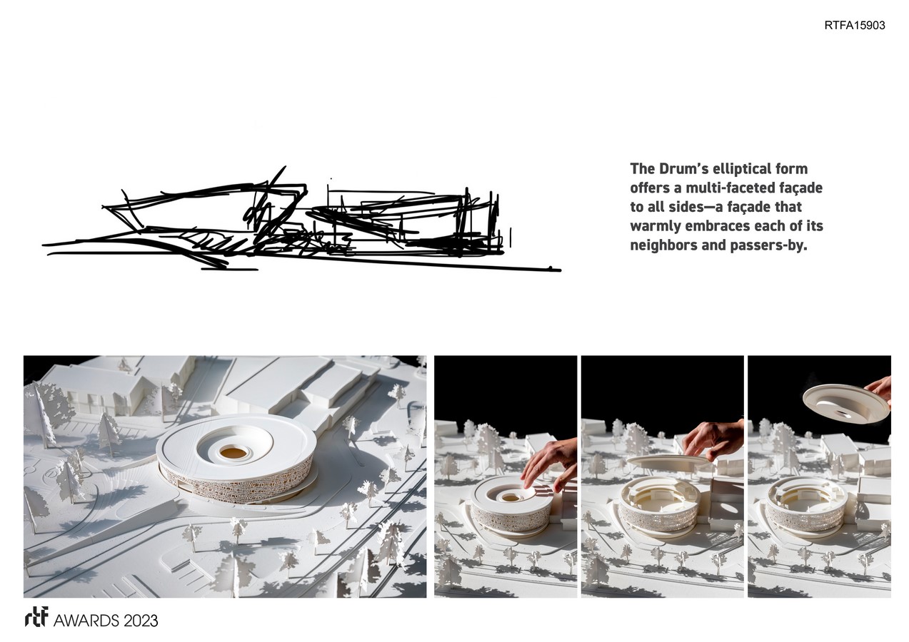Phase One begins with โ€œthe beating pulseโ€ of the project โ€“ the Drum, which functions as the โ€œCo-Edโ€ part of the formula, itโ€™s elliptical form warmly embracing each of its neighbors and passers-by. The northern green lawn, the future Phase Two location, will be an open outdoor event space until phase-two is constructed.