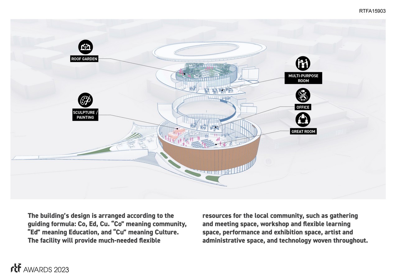 African American Cultural Center | Hanbury - Sheet2The building’s design follows the guiding formula of Co, Ed, Cu, which represents community, education, and culture. This formula ensures that the center serves not only as a physical space but as a dynamic and interactive environment that engages visitors in a meaningful way. With its design planned for two phases, the first phase features the community center, affectionately named “The Drum,” while the second phase focuses on the performance center.
