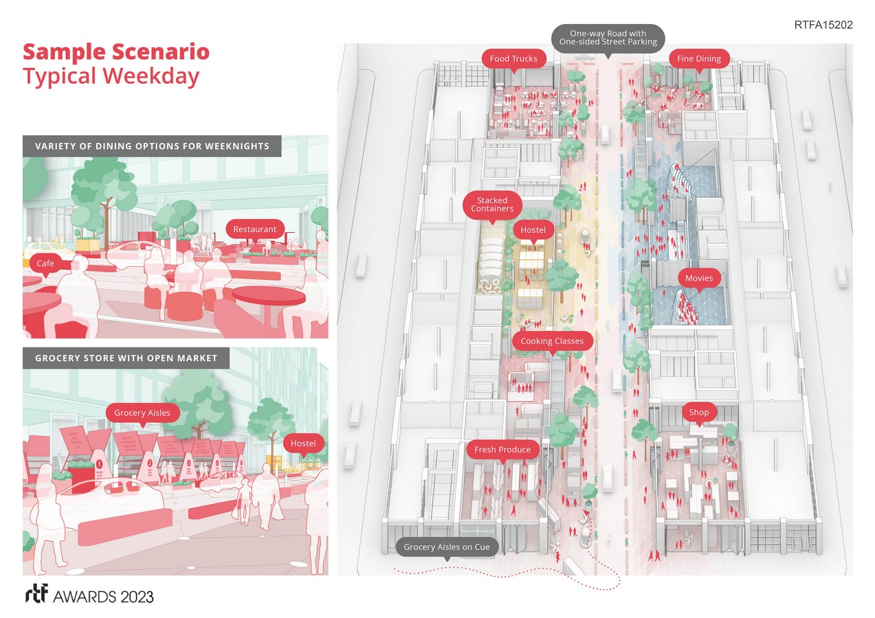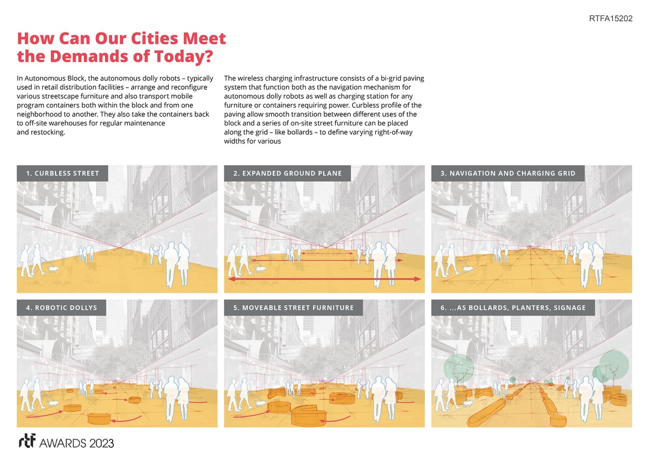 The typical city block hasn’t changed for a century, with little evolution in how sidewalks, curbs, streets, and storefronts are conceived. The United Nations projects 68% of the world’s population will live in urban areas by 2050, foreshadowing a decrease of urban open space. The Autonomous Block concept is innovatively answers to the question, “How do we rethink our streets to respond to the urban and social demands of the years to come?”