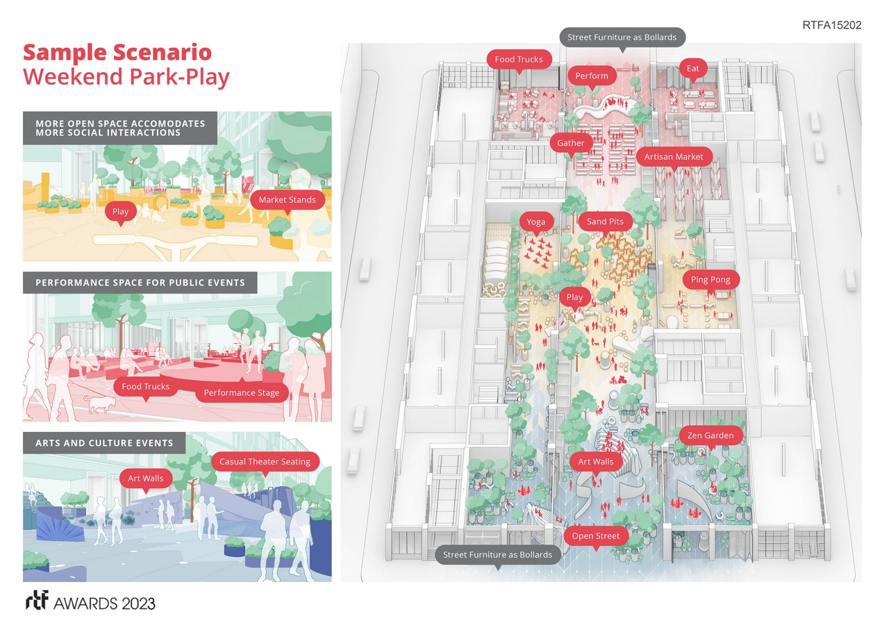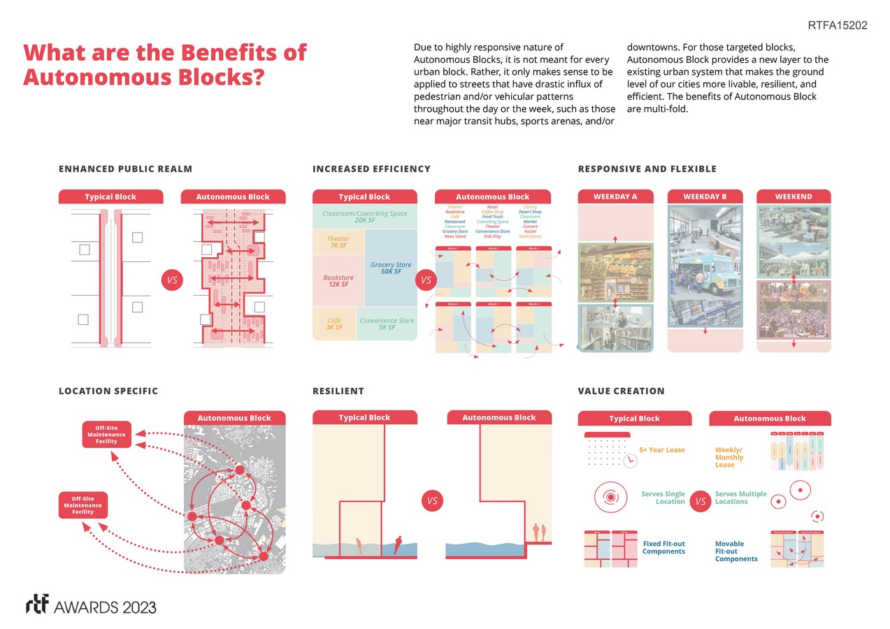 Autonomous Block is a new urban block prototype challenging traditional, stagnant and inflexible city-block typology. The ultimate “pop-up” host, the Autonomous Block concept provides a dynamic ground plane that transforms the urban realm through integrated technologies, accommodating a wide range of pedestrian and vehicular activities. Autonomous Block’s elements are an expanded public realm, curb-less streets, moveable street furniture, and mobile program containers—supporting uses from retail to daycare to you-name-it. Each Block morphs as needed, shifting from pop-up weekend village environment to robust weekday mix for urbanites to customized public event space.