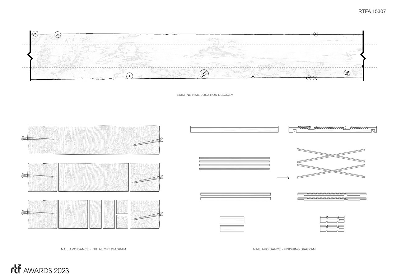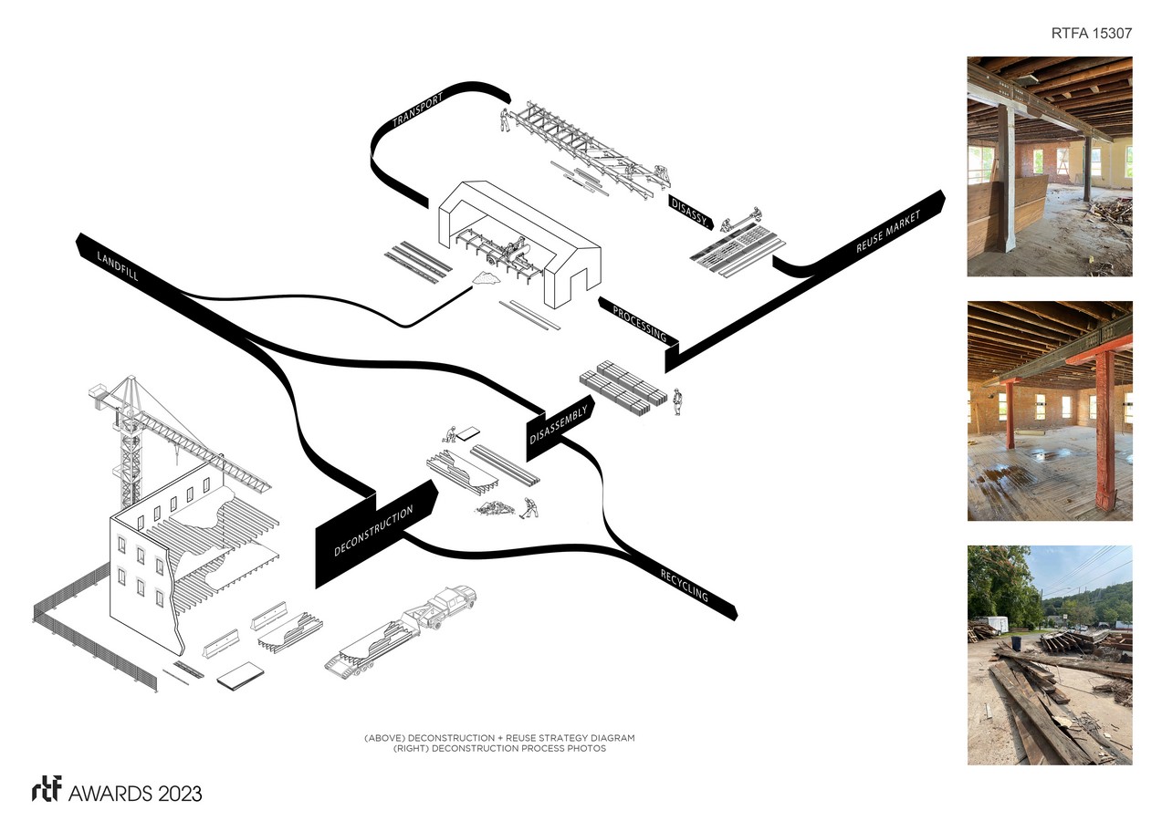 BoardWalk is part of a larger ongoing effort by the architects to reduce waste in the built environment. In late 2021, the architects were approached by a client with the hopes of developing strategies to maximize material reuse through the disassembly (as opposed to demolition) of a former ironworks and foundry building in central New York. Working with local contractors to develop methods for disassembling the four-story structure led to the recovery of 7,200 board feet of old-growth eastern hemlock and 6,000 sq. ft of red oak flooring that was diverted from the waste stream. Once disassembled, individual materials were cataloged, sorted, and inventoried for evaluation of future use potential.