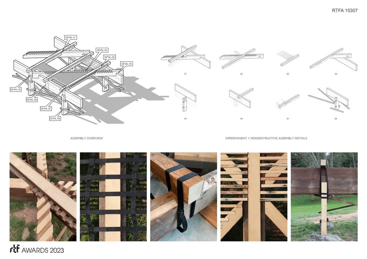 Once onsite a series of reversible nylon strapping connections are used to further stabilize critical connection points throughout the project while simultaneously offering hammock-like surfaces as playful moments designed for leisure throughout the project. The result is a seemingly floating compilation of materials that appears delicate in assembly yet massive in scale. Newly processed areas of each element juxtapose the old aging surface characteristics of the eastern hemlock wood based on one’s orientation bringing into question whether the project is something new or still a relic of the past.