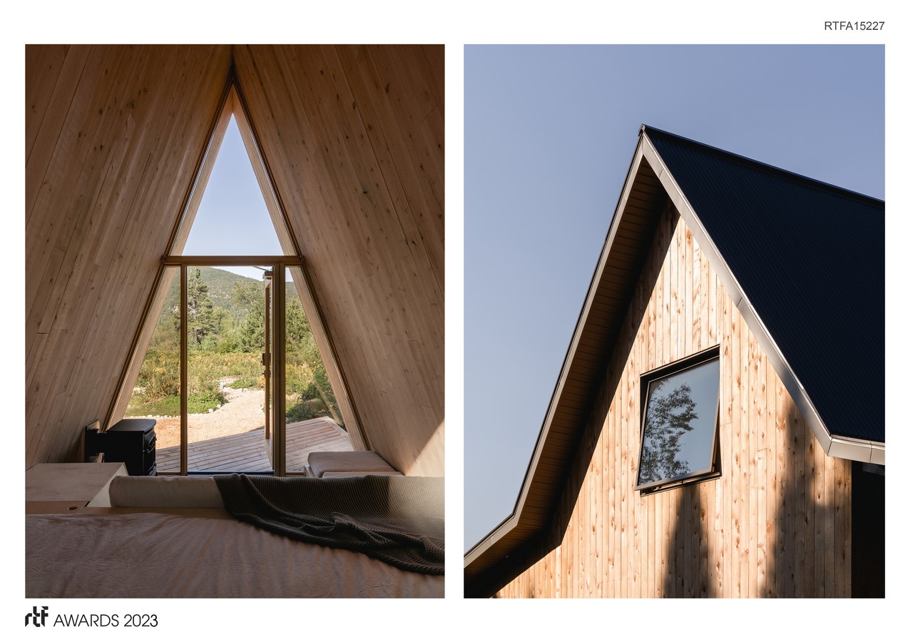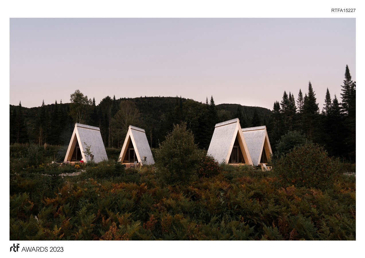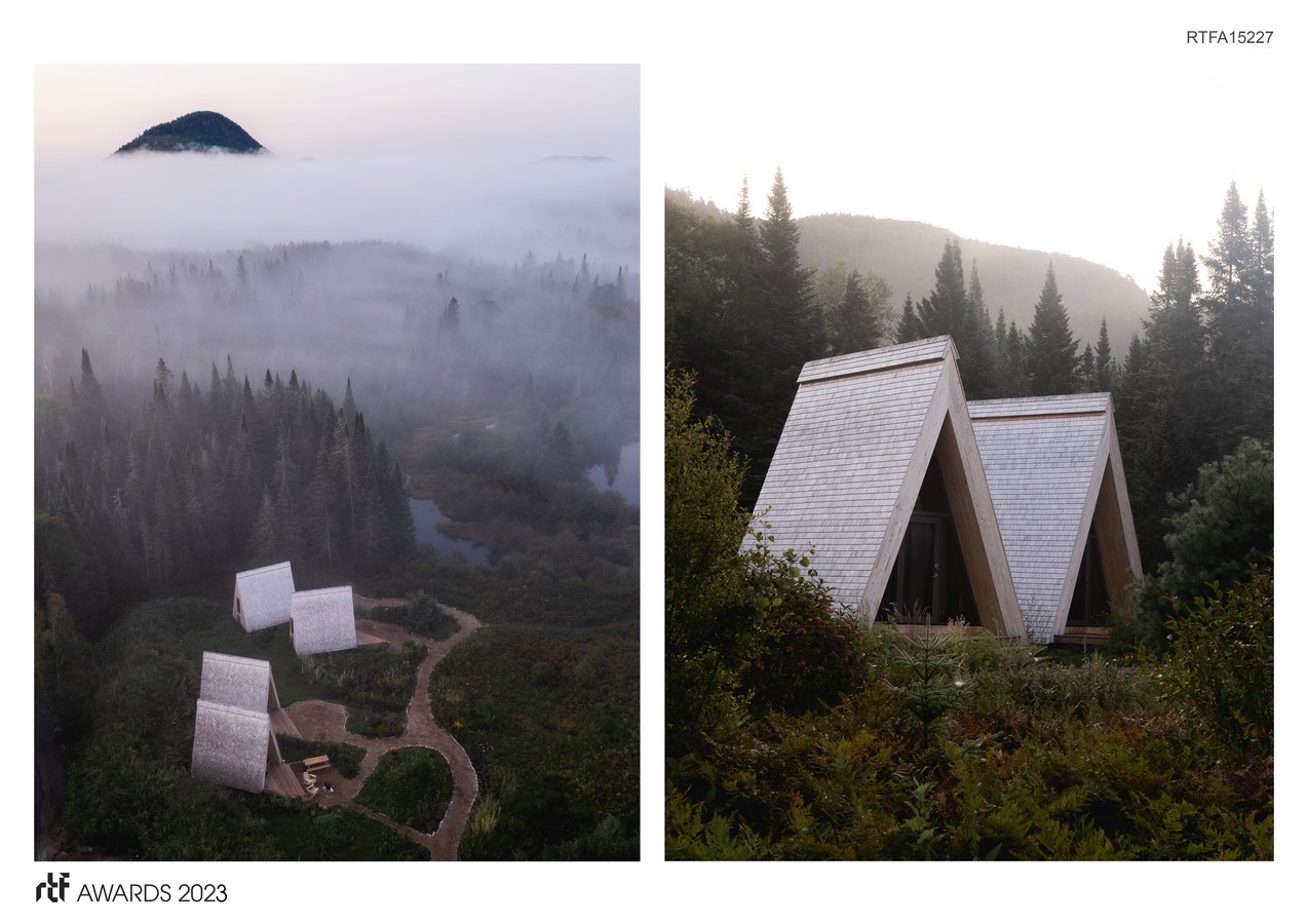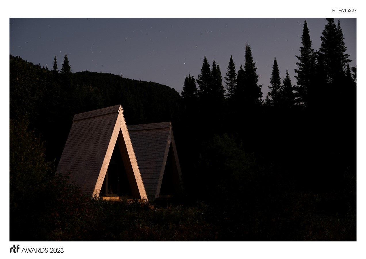Organized organically and connected by a winding path, the four small A-frame shelters each contain a king bed, a sofa and a gas stove within their compact 12 square meters plan. This implementation strategy has dual functions. It facilitates four-season access to the wilderness while creating relationships that are highly social and communal.