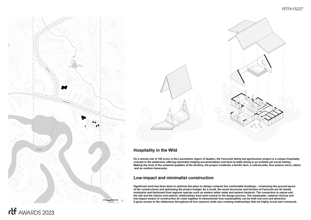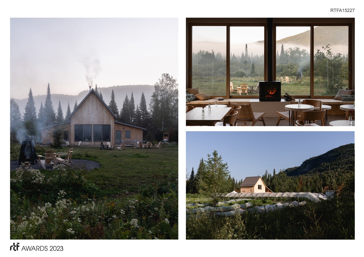 On a remote site of 100 acres in the Laurentians region of Quebec, the Farouche family-led agrotourism project is a unique hospitality concept in the wilderness offering minimalist lodging accommodation and sustainable farm-to-table dining in an isolated yet social setting.