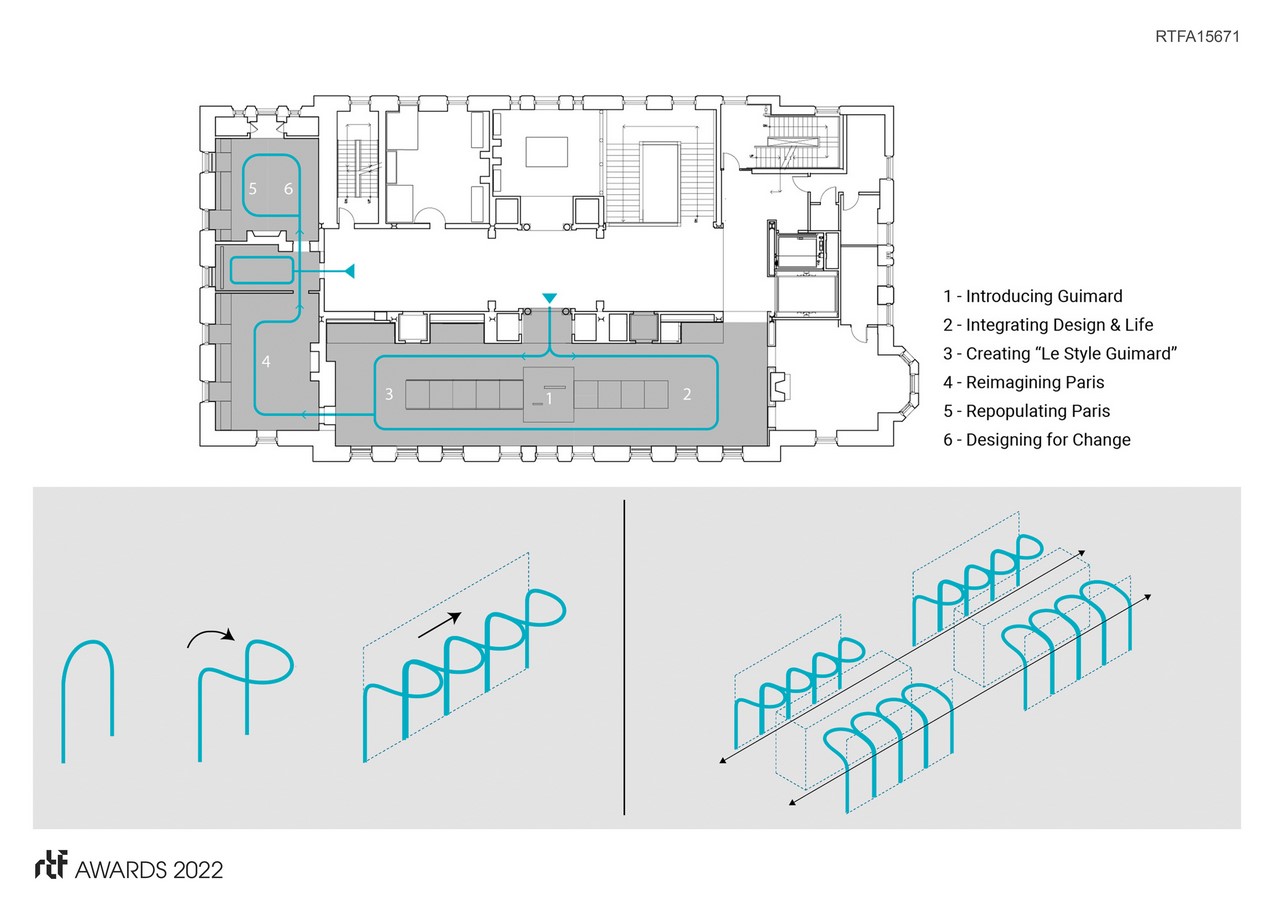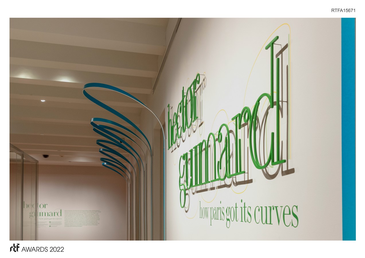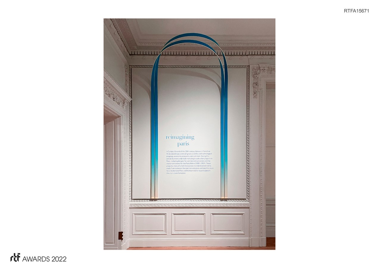 The colors that make up the two-tone gradient are used throughout the exhibition and serve multiple functions. The blue breathes life into the galleries by introducing a playful spirit and vibrant throughline. The cream color connects the graphics and arches, the cream-colored paper used in Guimard’s sketches, and the sepia-toned photographs seen throughout the exhibition.
