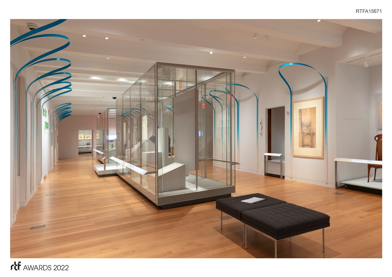 We accomplished this by creating a simple gestural architectural motif and a carefully considered graphic identity. The feeling is more contemporary, employing subtle nods to the modern design objects also found within the exhibition. We created looping forms from ยผ” thick “Sintra,” twisting a single strand so that when wall-mounted, it stays upright due to the structural integrity of the arc. The arches, printed with a color gradient, delineate a path of travel and frame section text panels in each gallery.
