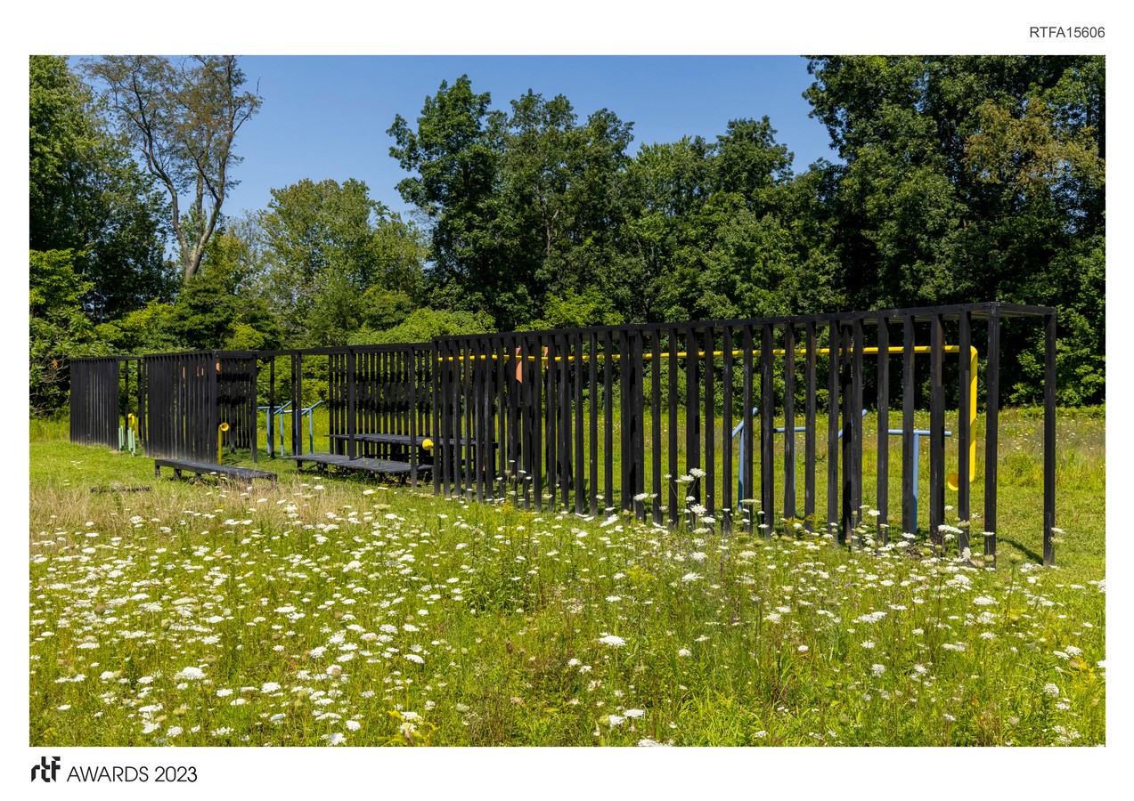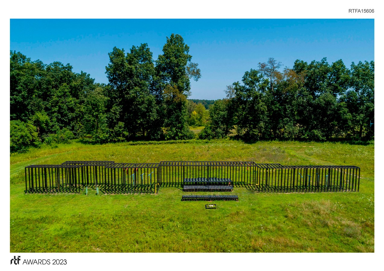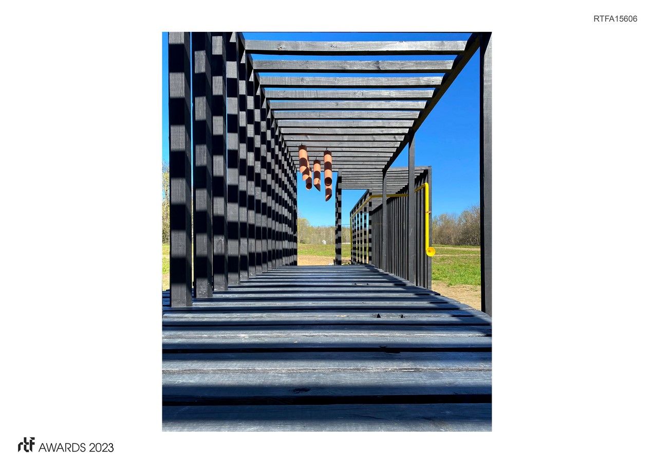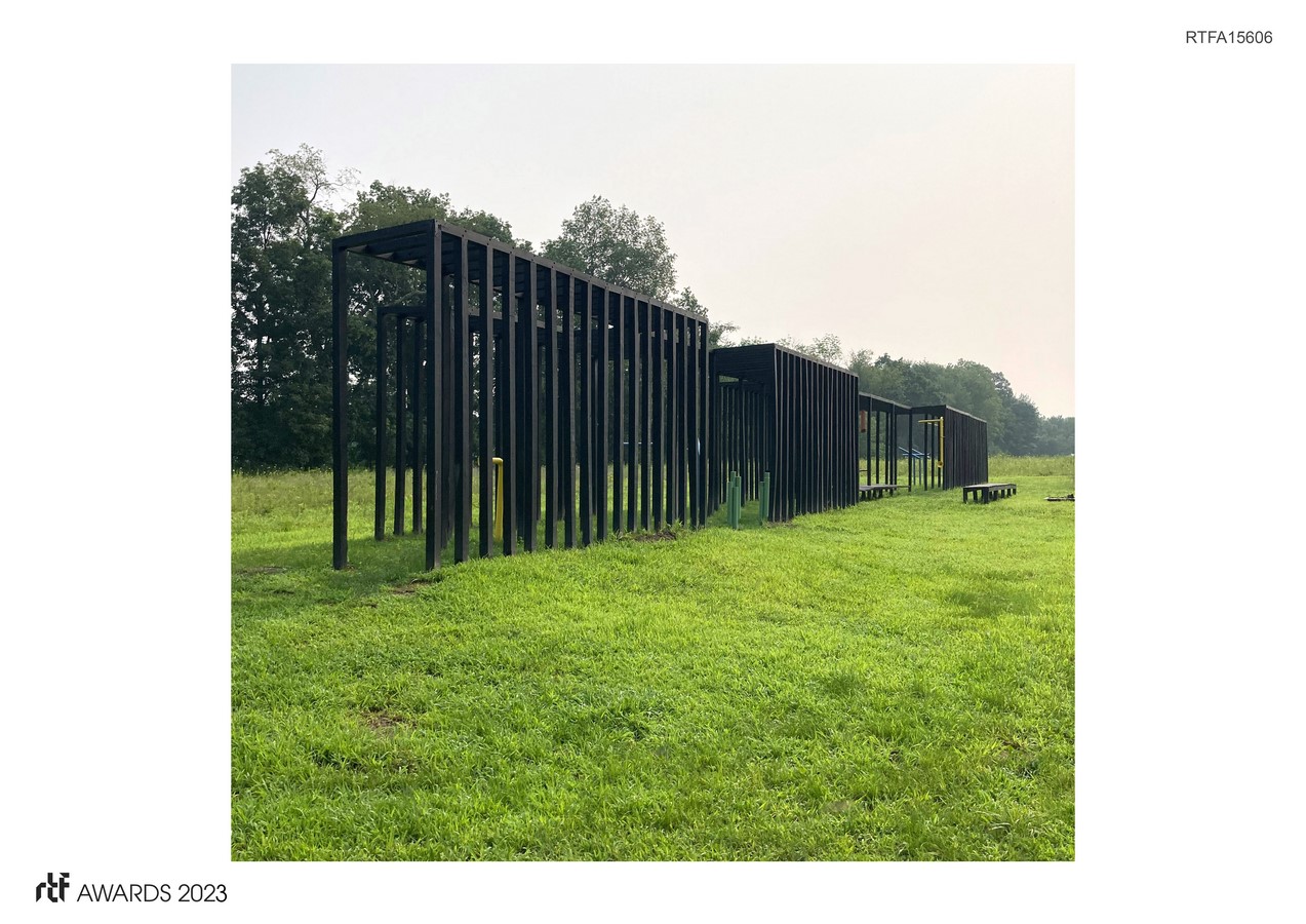 - 126, 4×4-inch, 10-foot-high posts, stained black. They are organized into a 3-part pathway that leads from the woods to an open meadow. The wood frames create an armature for sensory opportunities, both collective and personal. The 125-foot-long structure runs on the east/west compass points for solar orientation.