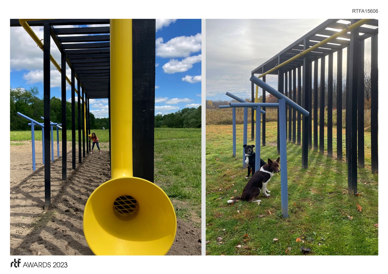 - There are four types of sensory experiences. They are custom-fabricated metal forms dispersed into the wooden structure, each with an interactive component. Green: A gathering of pipes that hover over herbs. Blue: Periscopes aim at the trees and the sky, focusing on that magical place where earth and atmosphere meet. Coral: wind chimes swing softly from the joists above. Yellow: There are two 30-foot lengths of pipe with bell-shaped megaphones at either end; one is above, hung from the armature, and the other is buried below ground. They allow visitors to talk with each other through this surprising low-tech invention.