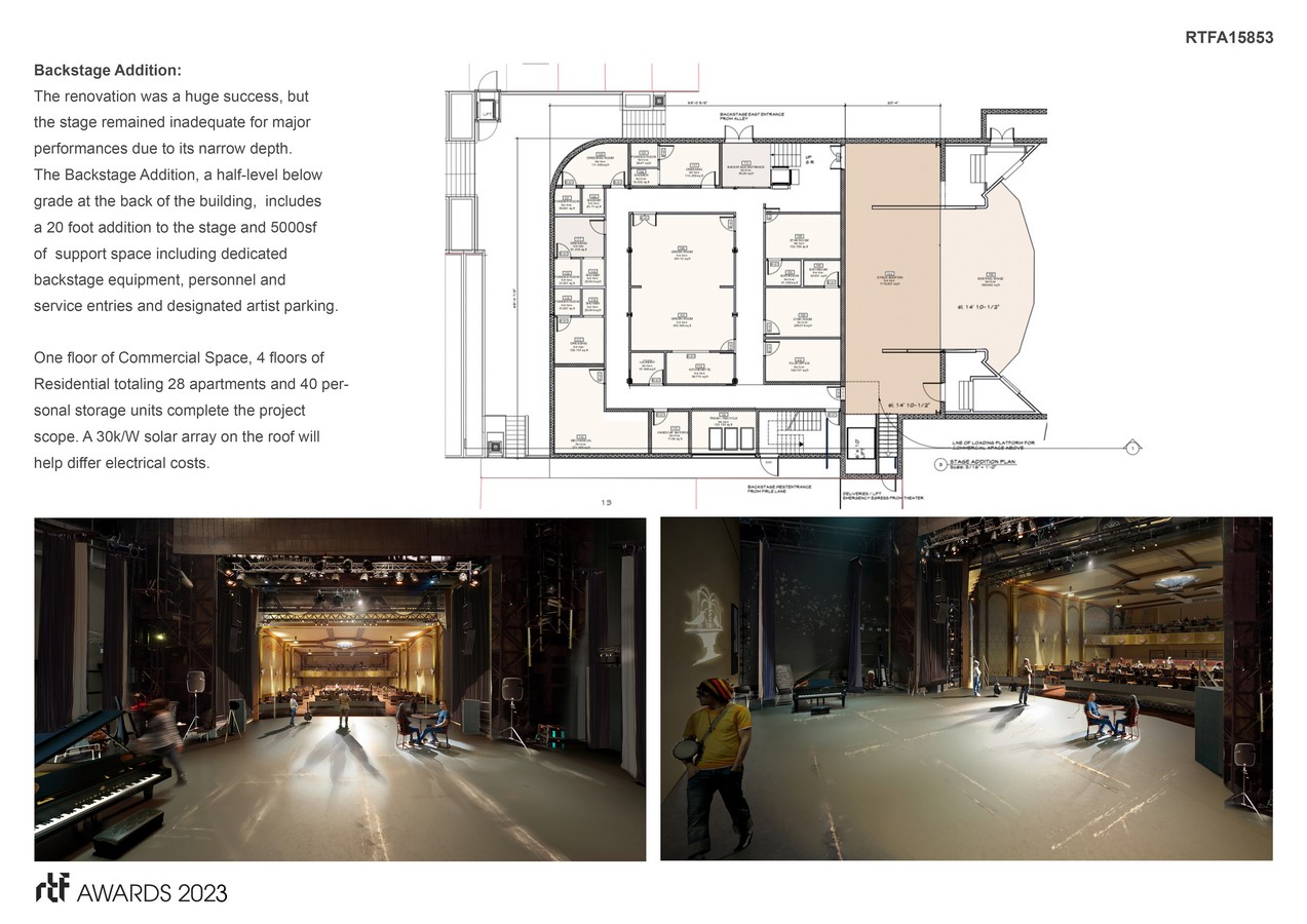 The renovation was a huge success, but the stage remained inadequate for major performances due to its narrow depth. The proposed Backstage Addition, a half-level below grade at the back of thebuilding, includes a 20-foot addition to the stage and 5000sf of support space, including dedicated backstage equipment, personnel and service entries, and designated artist parking. One floor of Commercial Space, 4 floors of Residential totaling 28 apartments, and 40 personalsstorage units complete the project scope. A 30k/W solar array on the roof will help defer electrical costs.