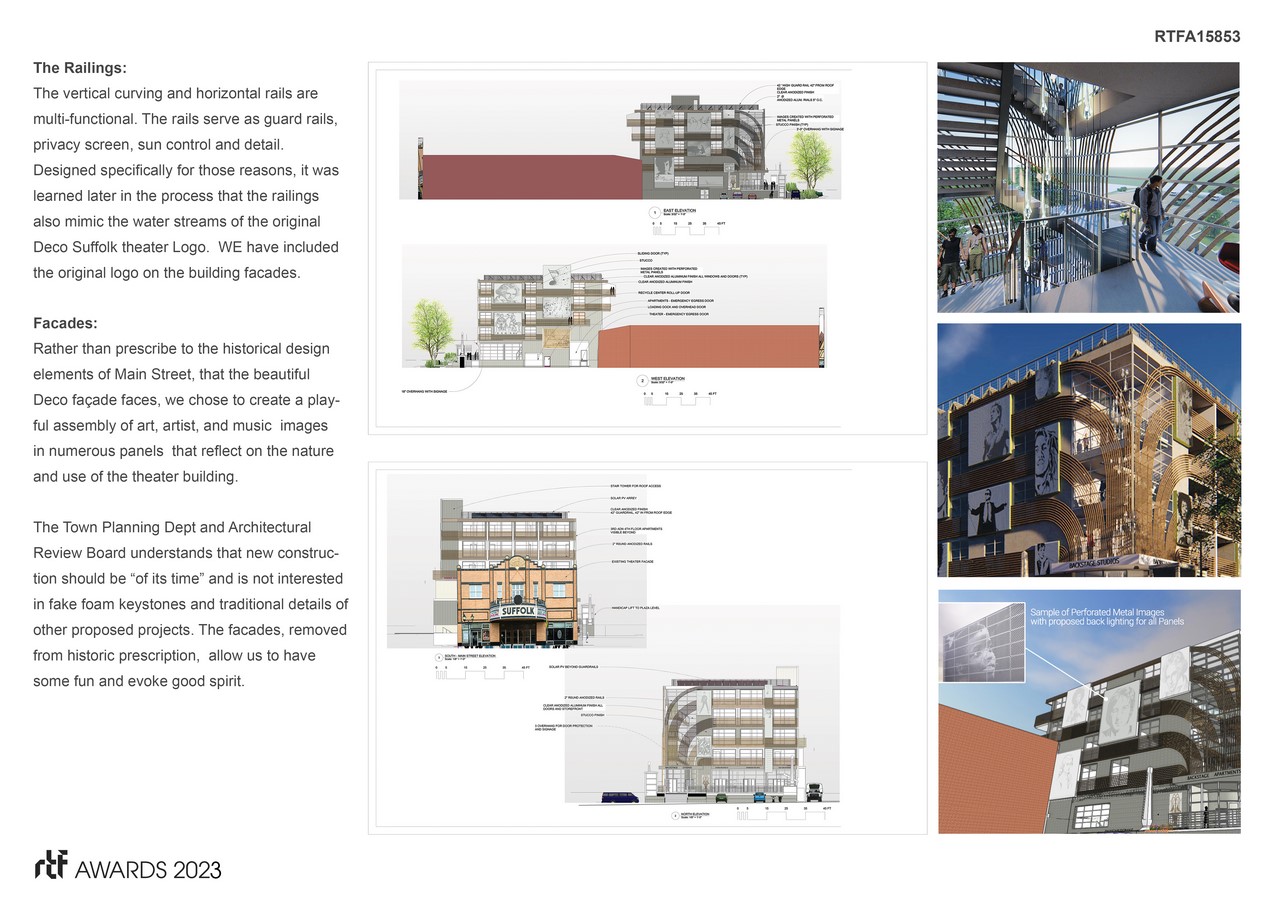 The vertical curving and horizontal rails are multi-functional. The rails serve as guard rails, privacy screens, sun control, and esthetic detail. Designed specifically for those reasons, it was learned later in the process that the railings also mimic the water streams of the original Deco Suffolk Theater Logo. The original logo was then incorporated in the design and included on the building facades.