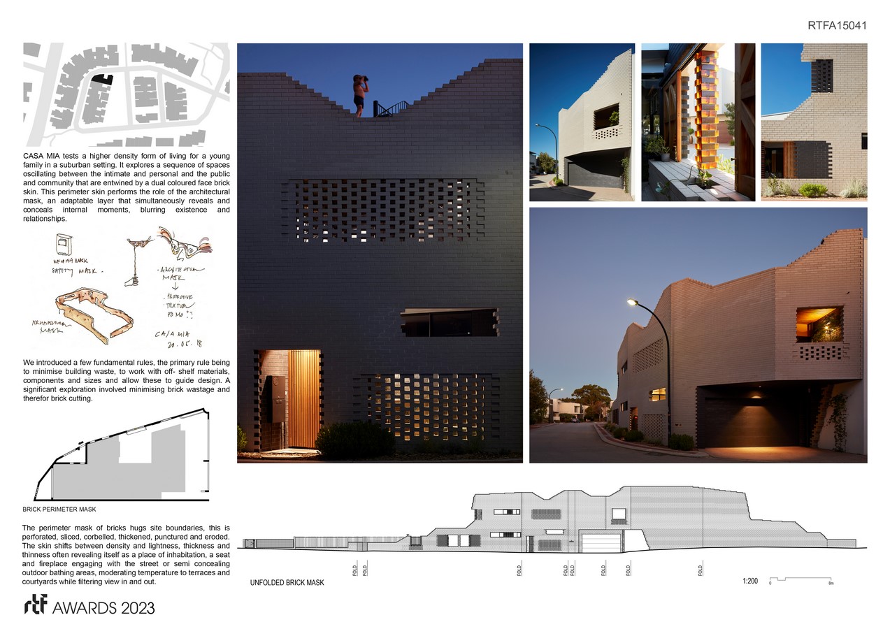 CASA MIA tests a higher density form of living for a young family in a suburban setting. It explores a sequence of spaces oscillating between the intimate and personal and the public and community that are entwined by a dual coloured face brick skin. This perimeter skin performs the role of the architectural mask, an adaptable layer that simultaneously reveals and conceals internal moments, blurring existence and relationships.