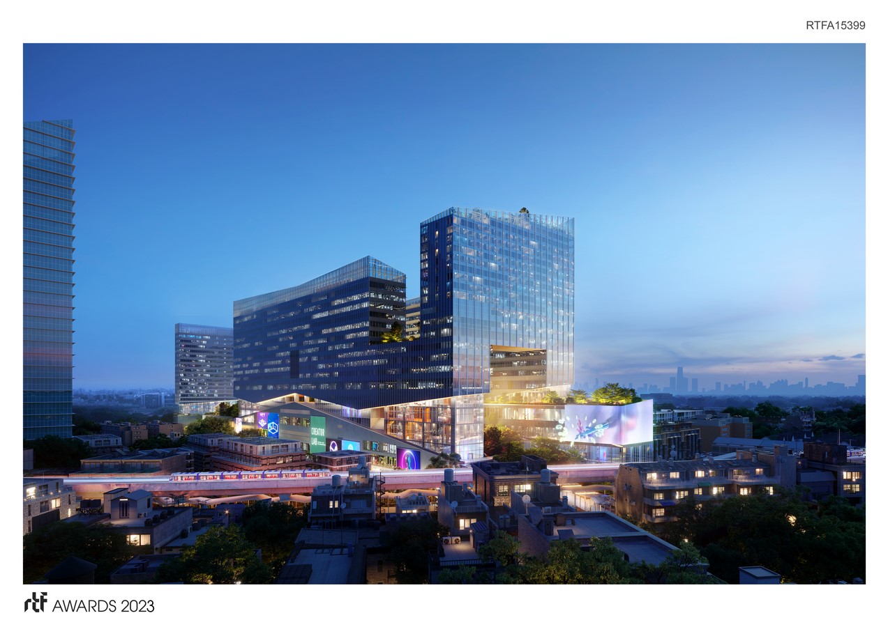Bringing the entire ecosystem under one roof, Cloud 11 features a creator retail podium, creative workplaces, smart hotels, tech education, and an arena for live performances and e-sports competition. Inspired by its rich surroundings, Cloud 11 stacks three layers of urban contexts –shophouses, elevated paths and the city skyline – creating the captivating “in-between” void. Inherits and interprets the scale, rhythm, profile and skyline.