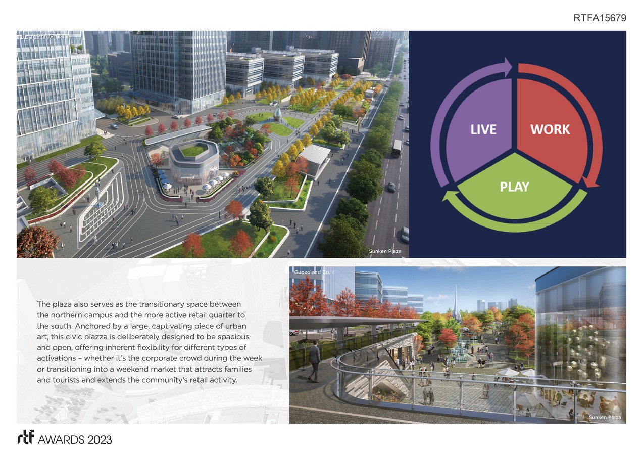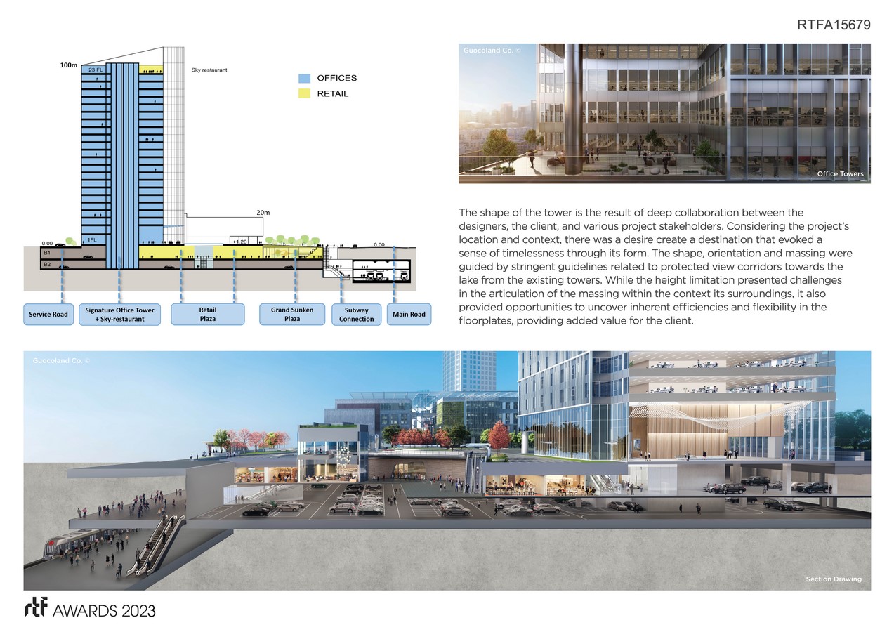 The design adapts the concept of a green & ecological urban campus to reflect Guocoland’s unique vision. The development includes two office towers, three low-rise office buildings and two basement levels, punctuated by public spaces stretching across the complex.