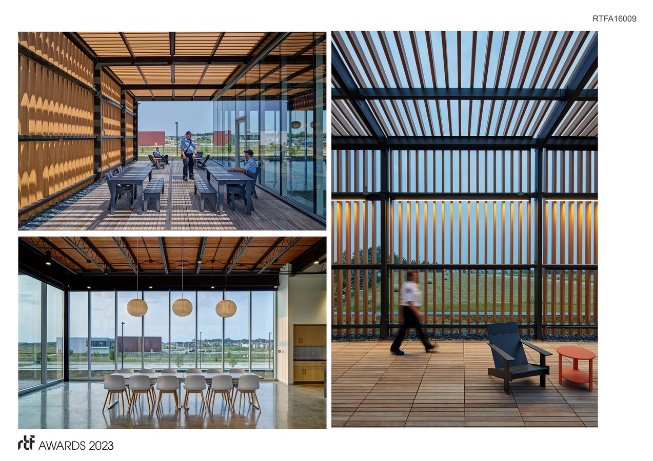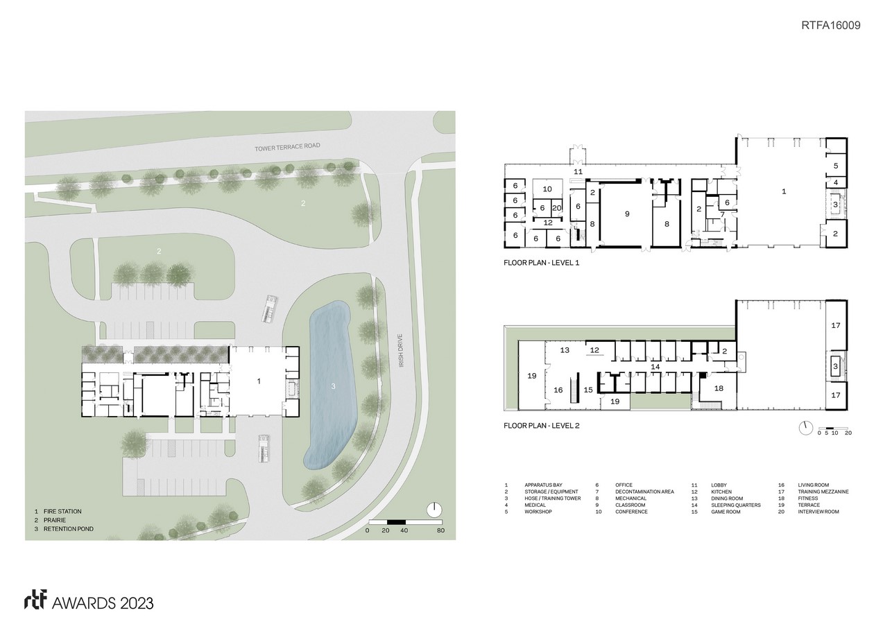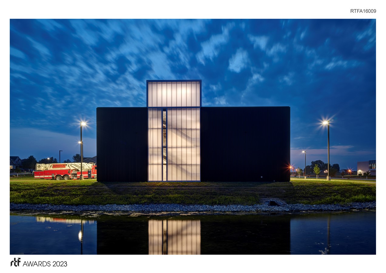 Strategic sequencing of spaces, including a decontamination clean room, between the bays and the office and living areas mitigate exposure to fire and ash carcinogens. On the opposite side of the bays, the hose-drying tower also serves as a training area to simulate rescues. Training opportunities continue at the exterior where the retention pond is also used to train for ice rescues.