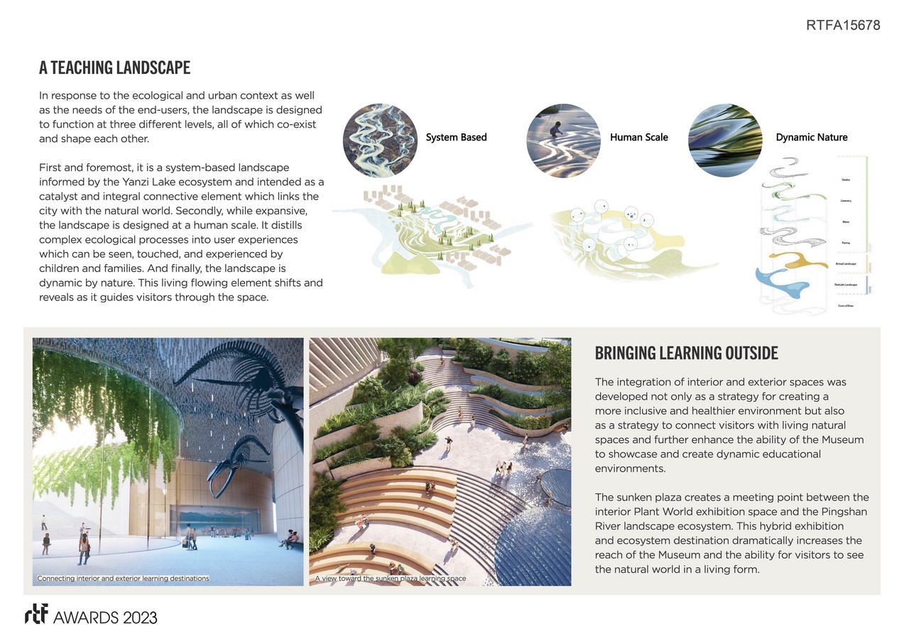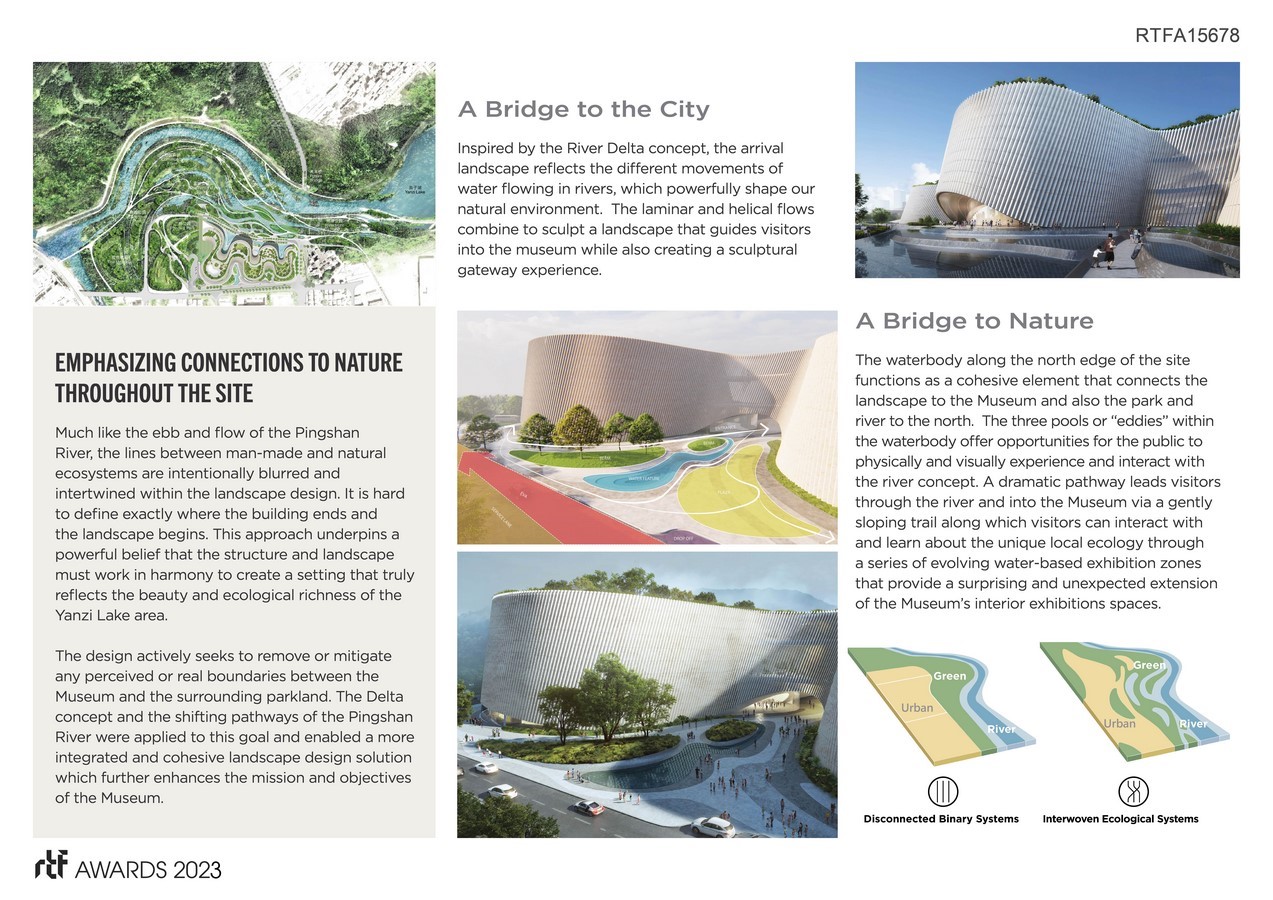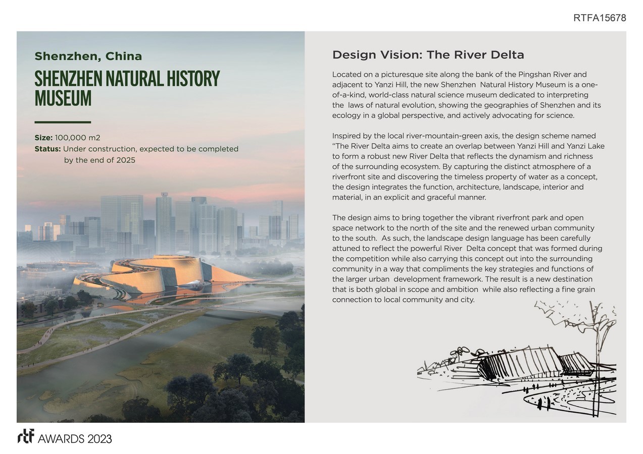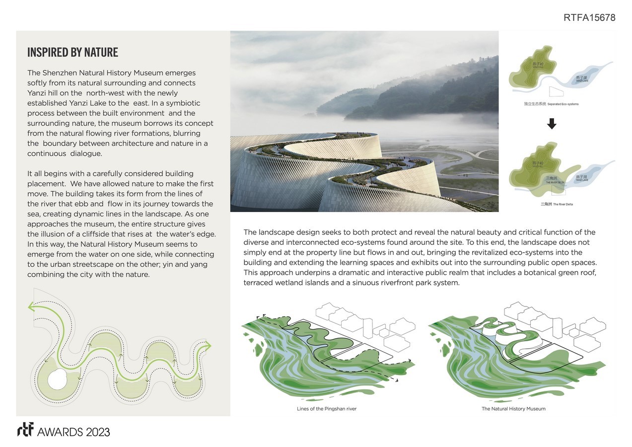 Shenzhen Natrual Hisotry Museum is located adjacent to the picturesque Yanzi Lake in the Pingshan District of Shenzhen. The new 100,000 sqm facility will become a world-class natural history museum dedicated to interpreting the laws of ecological evolution, showing the geographies of Shenzhen and its ecology from a global perspective, and actively advocating science. Inspired by nature, the strategy for the site is to create an overlap between Yanzi Hill and Yanzi Lake to form a robust new River Delta that reflects the dynamism and richness of this ecology.