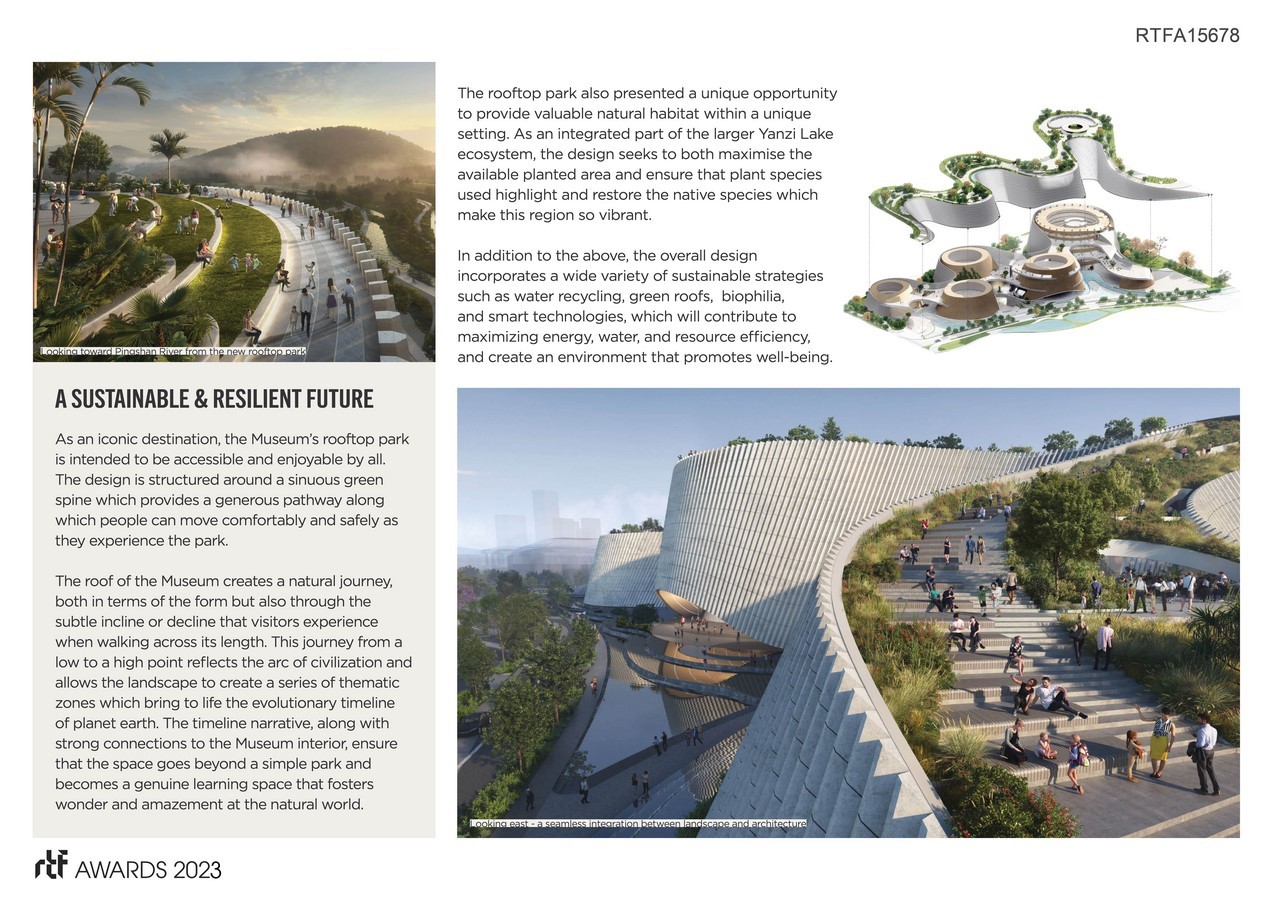 The museum finds its shape along the river’s natural lines, as if the river flow slowly eroded through the soft geological layer and finally revealed its core volume. The vertical cliff sides are framed by water at the base and topped by a lush and active public park. Visitors to the museum will embark on a journey through natural history in each of the exhibition spaces. The different stages of nature’s history can also inform the interior design vision throughout the museum to create a completely immersive experience for visitors.