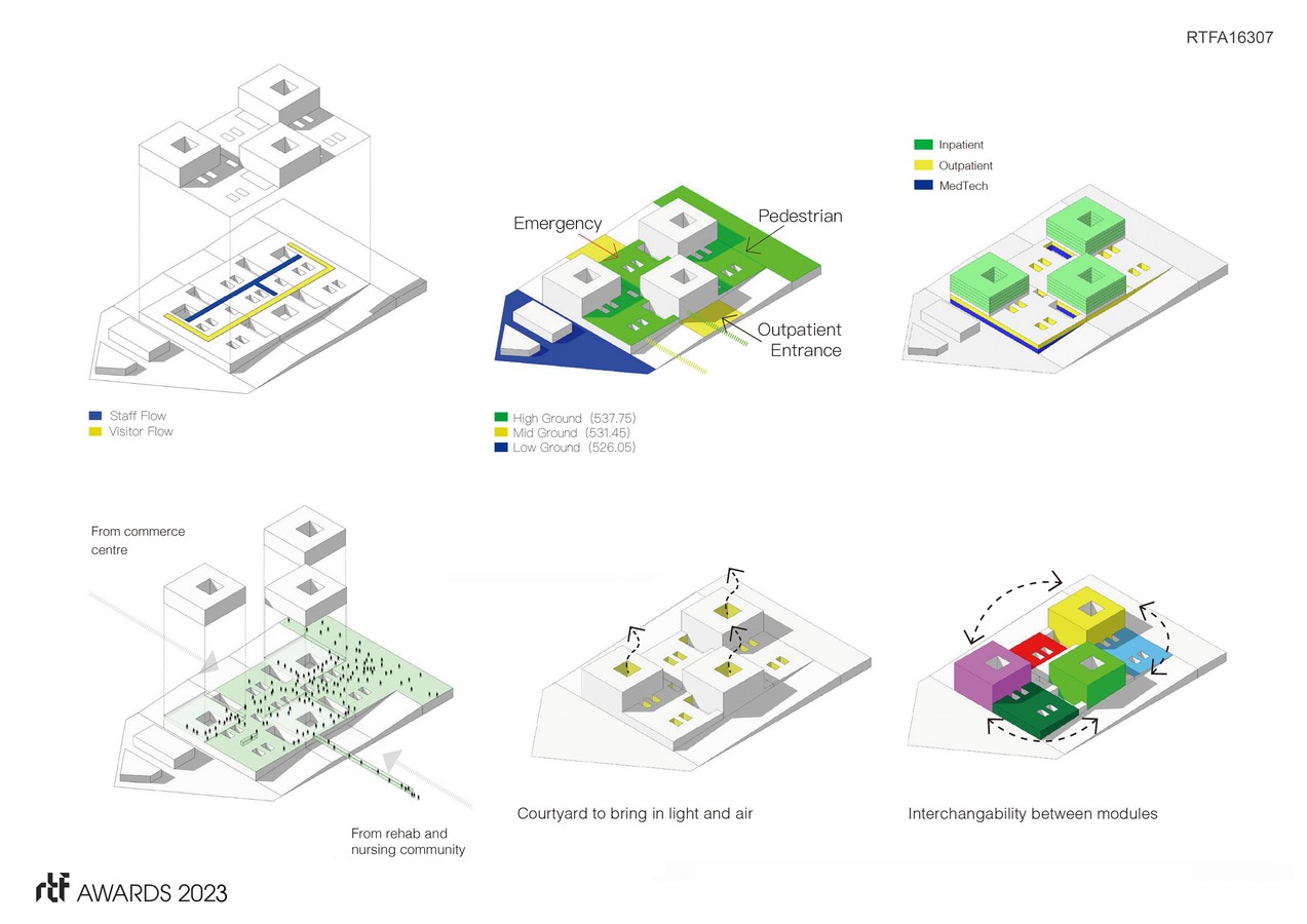 The courtyard-style architectural design brings sunlight and fresh air into each floor, and the modular space design enables easy conversion of hospital departments. Each phase of the three-phase development can be moderately and evenly developed, avoiding excessive investment in medical technology in the early stage, while allowing the hospital to form six major discipline centers for future development, thus having more intimate specialized service capabilities.