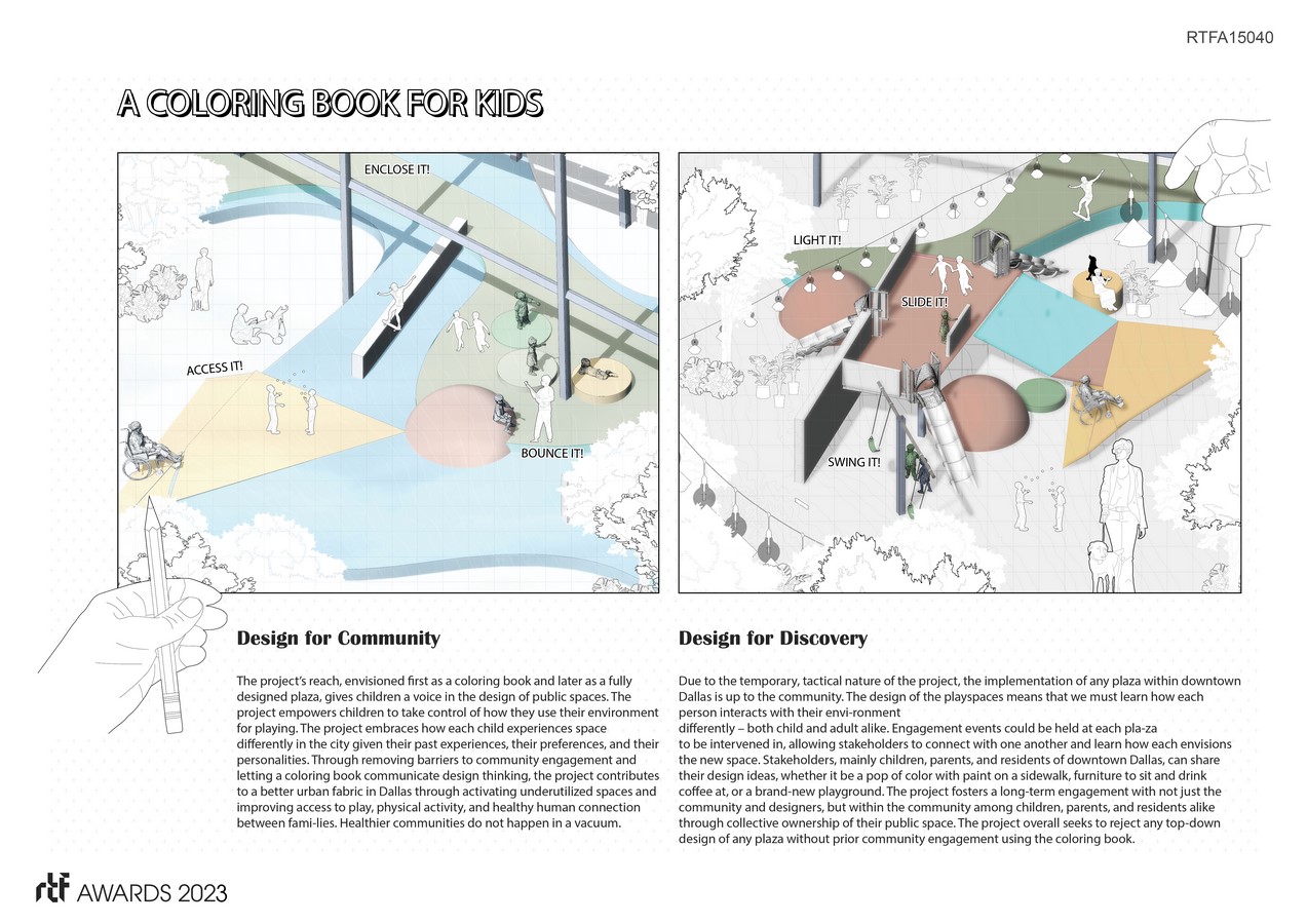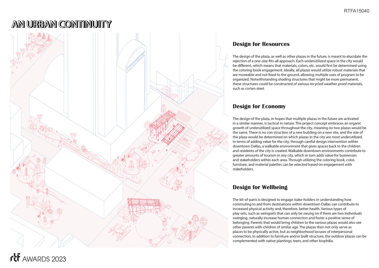 The project is based on the finding that Downtown Dallas is experiencing a renaissance of growth, especially a rapid increase of the family and children demographic. Yet many of the city’s valuable public spaces are disconnected and disengaged from the community. The outcome for this project is to create a series of playful learning spaces for children throughout the city through animating the daily journey for the public at large. Ultimately, the goal is to form an urban continuity where the city is better connected through collective agency over the creation and use of public spaces.