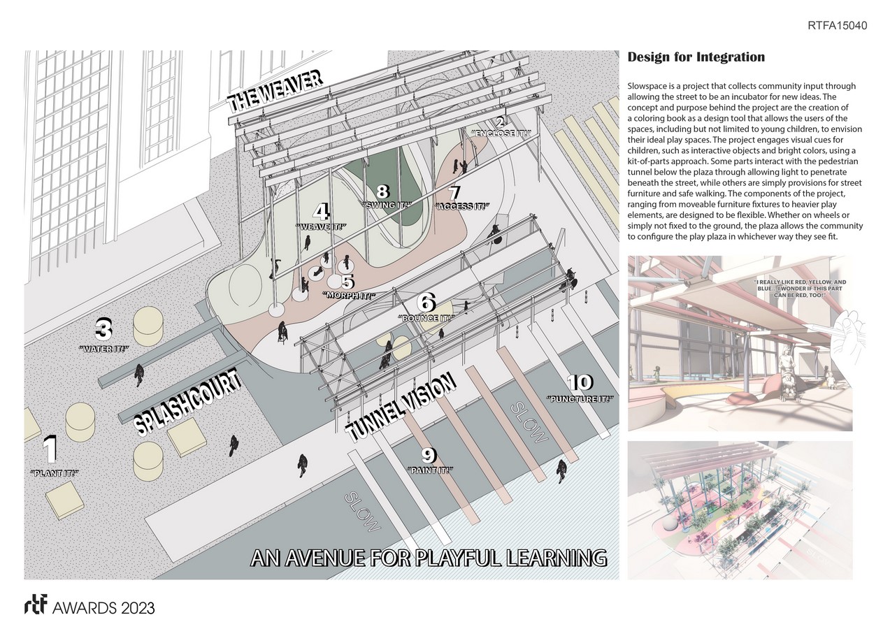 SLOWSPACE starts with designing for children to provide a safe, playable and colorful space where people of Dallas are given the opportunities to design their own public space with a kit of parts approach made of a variety of modular, flexible and transformable structural elements, as well as different urban furniture and ground material variations.