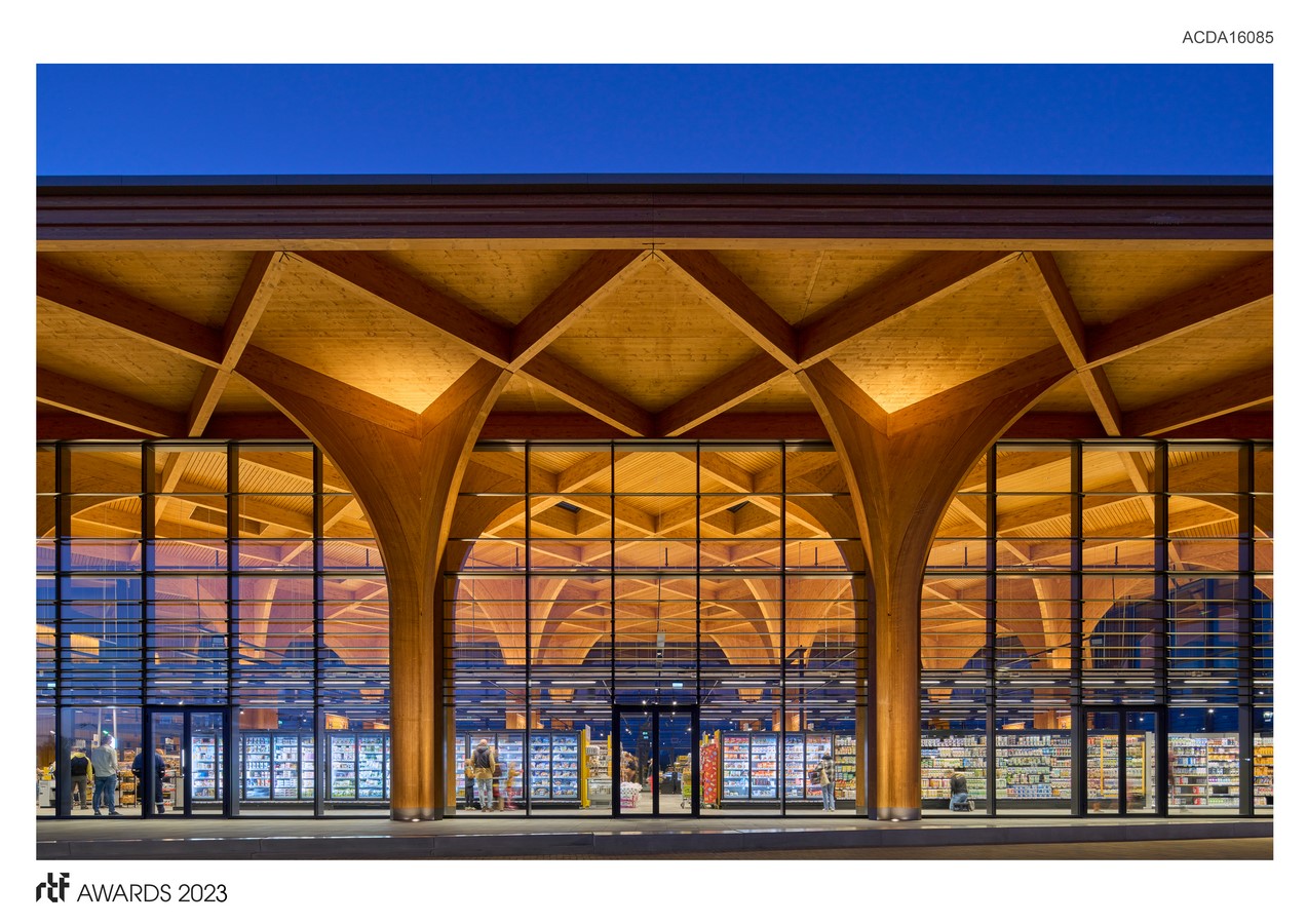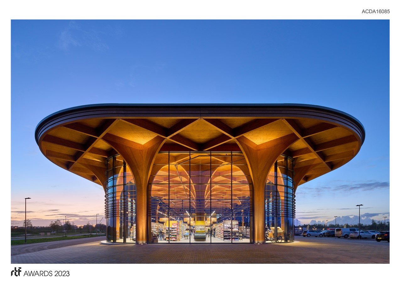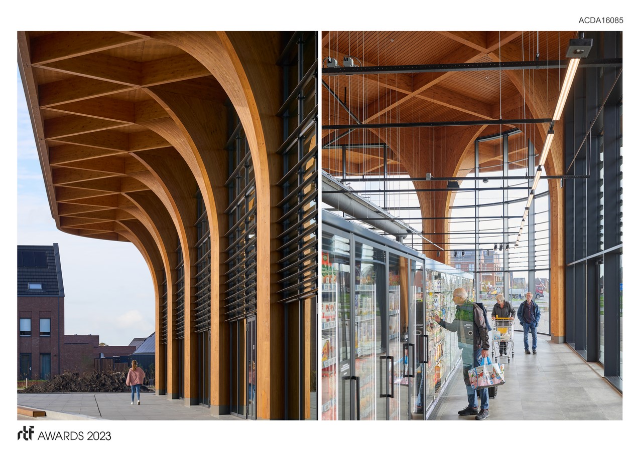 SuperHub offers the Meerstad neighbourhood an opportunity for varied functionality, and currently includes a supermarket and a cafรฉ. The open and spacious building functions as a meeting place for residents in addition to its function of providing food. Our aim was to make the shopping experience personal and social again, and to offer residents a refreshing alternative to the increasingly popular express delivery services. The impressive spatial qualities of the structure are essential here to fulfil its purpose as an attractive and multifunctional community centre. This way, the supermarket becomes a place for everyday groceries as well as way for meeting each other, thereby contributing to the social sustainability of the Meerstad neighbourhood.
