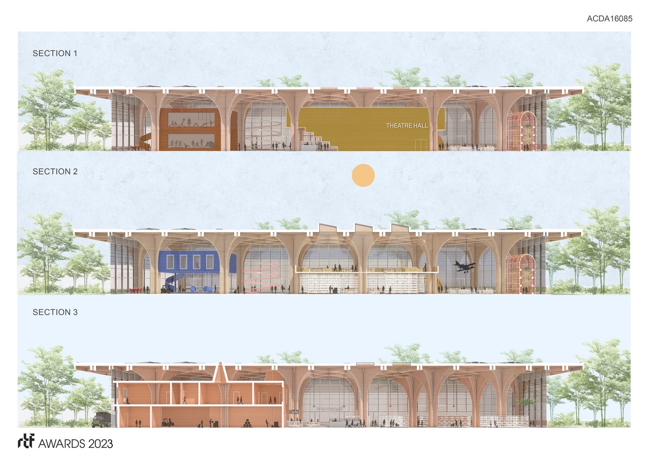 SuperHub represents a revitalised circular version of the traditional market hall design. It is expansive and transparent, with a supporting structure made entirely of cross-shaped laminated wooden columns and beams, which give the building a cathedral-like appearance. The large span and nine-metre ceiling height create an exceptionally luminous space and offer the opportunity for flexible layout and usage adaptations in the future. The large canopy provides sun protection and pulls the structure into its green surroundings with the use of elegant columns and net-like wooden trusses. Additionally, the cleverly designed cross forms provide the building with stability, so that no additional wind bracing infrastructure is required and it can withstand the vibrations of Groningen earthquakes. The wooden construction also ensures a positive climate impact, and the roof of SuperHub has been reserved for the placement of solar panels and plants for bees and insects. The built-in air treatment installation as well as the heat and cold ground storage ensure an optimal and energy-efficient indoor climate.