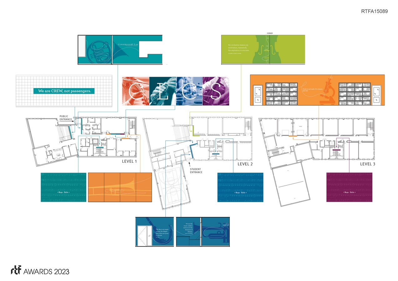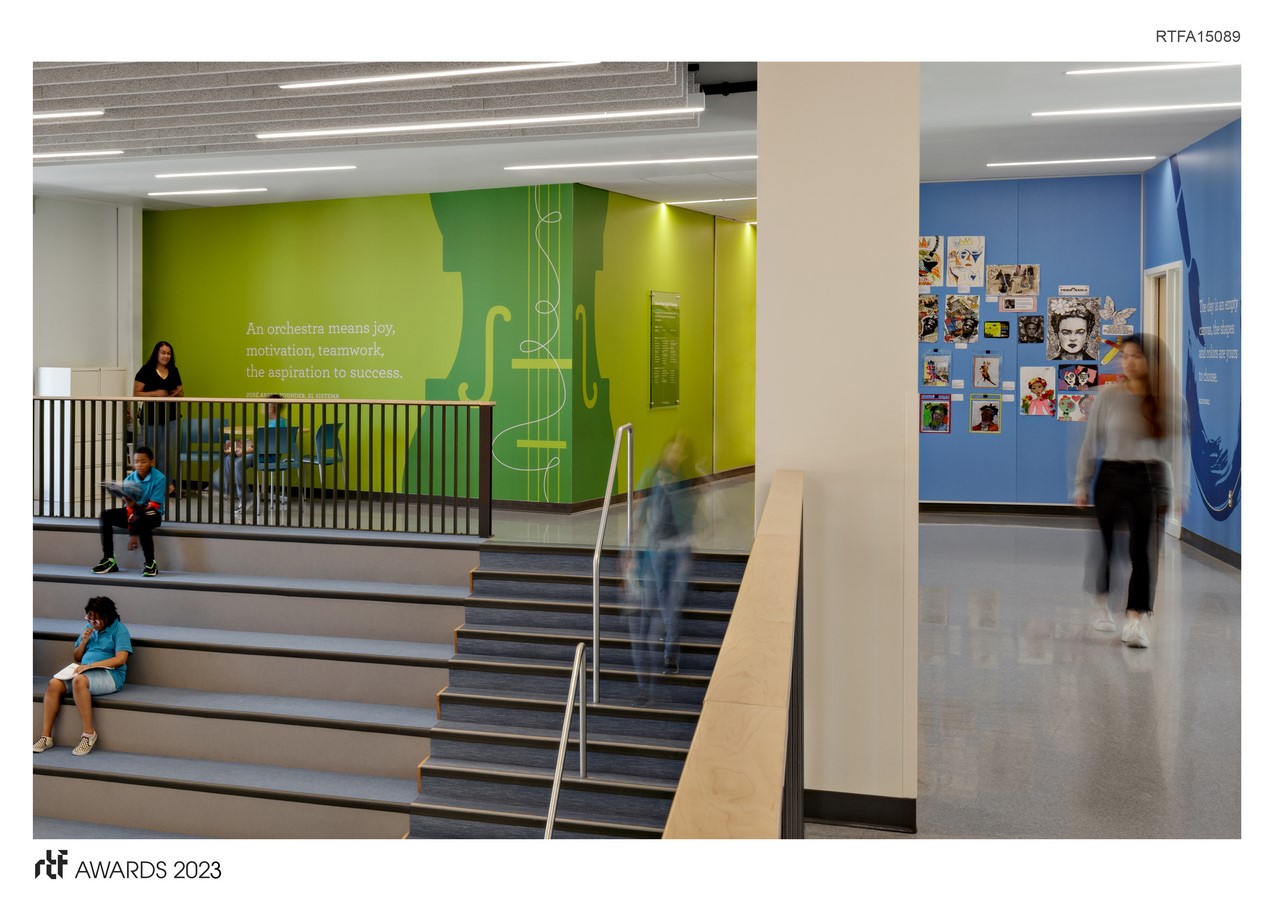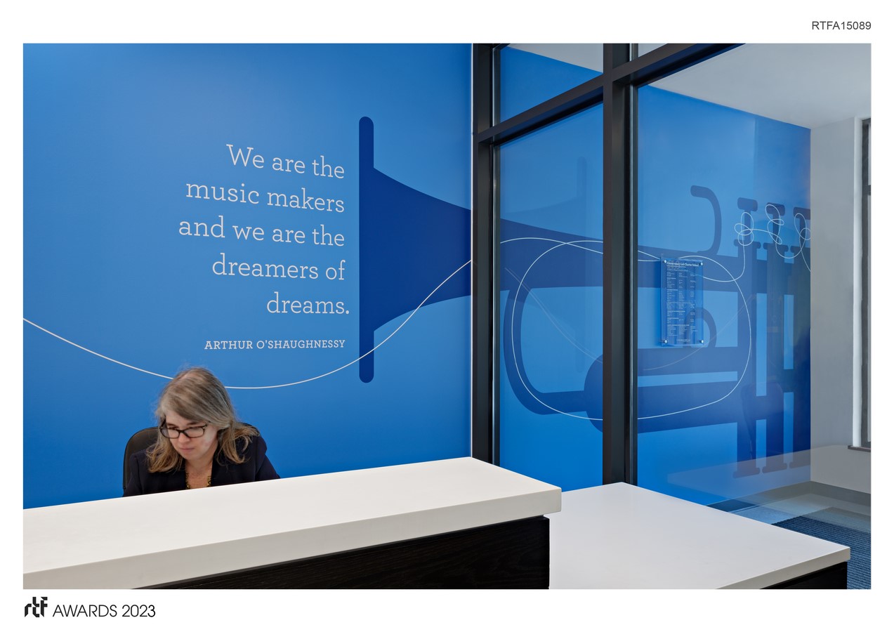 At the heart of the environmental graphics is the main theme, โThe Shape of Music,โ which showcases the beauty of musical instruments and the ways in which music can be visually represented. The oversized musical instrument silhouettes, rendered in the schoolโs vibrant color palette, serve as focal points in key gathering areas throughout the building, and are paired with inspiring quotes from the programโs founder and other notable figures such as Bruno Mars. Additionally, to highlight the diverse range of subjects taught at the school beyond music, oversized instruments representing other areas of study are displayed on the walls leading to the corresponding classrooms. art and science rooms.