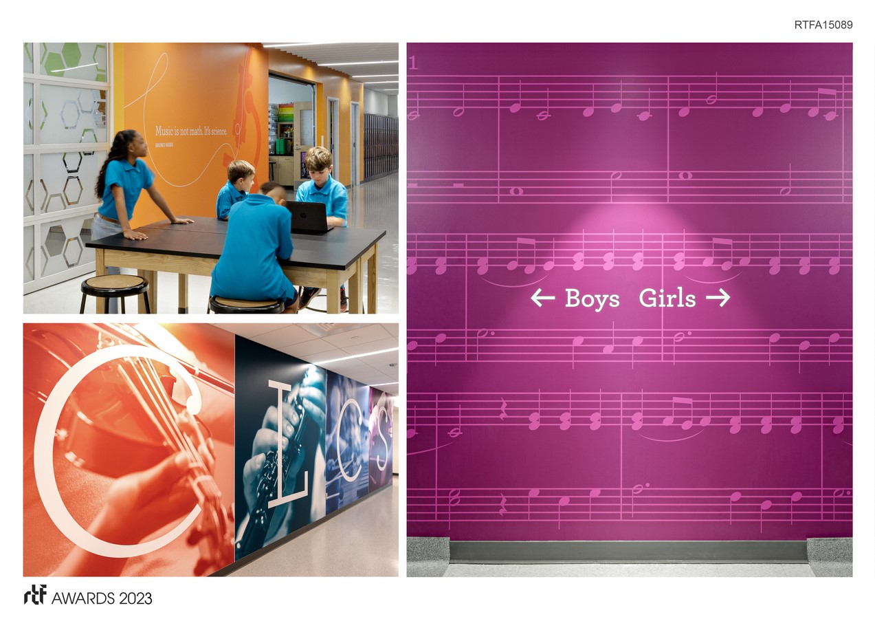 The wall outside the Main Ensemble Room is a testament to the hard work and dedication of the schoolโs students, featuring duotone images of students playing instruments in both practice and performance. And oversized sheet music featuring Handelโs โWater Musicโ adorns the exterior walls of the restrooms, providing a humorous discovery for the musically-savvy.