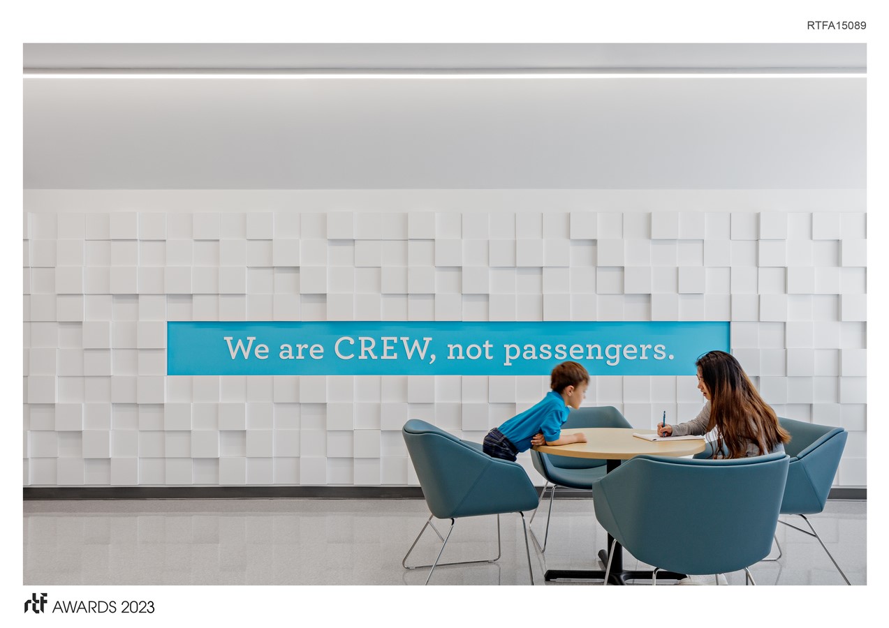 The schoolโs motto, โWe are crew, not passengers,โ takes center stage in the main reception area, surrounded by a dramatic three-dimensional wall designed to capture the rhythm and movement of music. This installation not only provides a warm welcome to visitors, but was designed to showcase student artwork, reinforcing the schoolโs message and giving passing onlookers outside a glimpse into the schoolโs vibrant culture.
