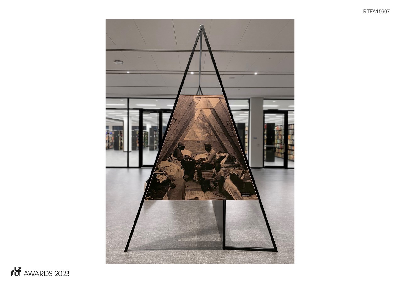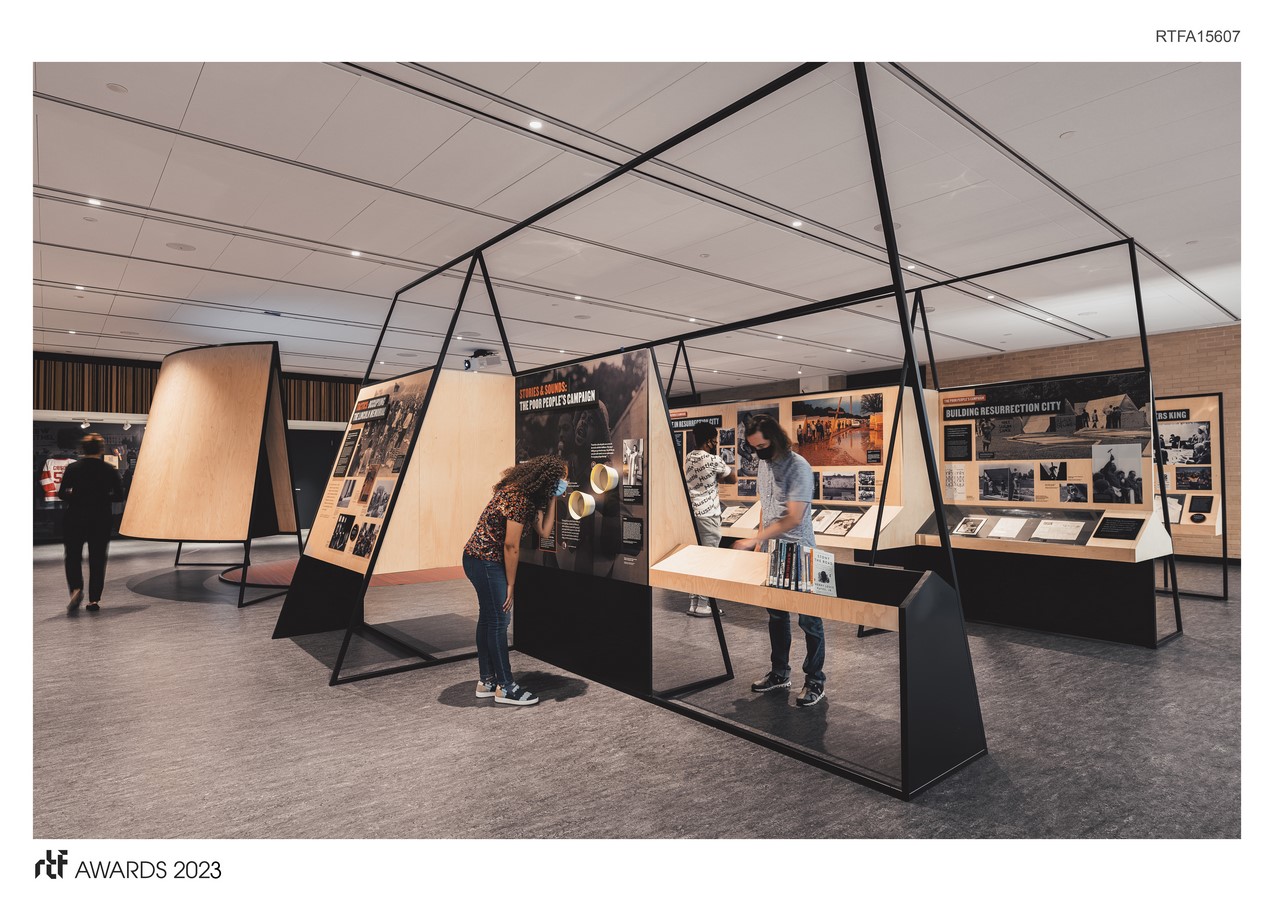 Architecturally the design strategy was to leave visual transparency through the exhibition to continue the Miesian concept of bringing natural light to the core of the space. A series of bespoke armatures use 1-inch tubular steel and oak-veneered plywood as displays. On one side of the gallery, they are triangular in form echoing the tents used during the โPoor Peopleโs March.โ On the other side, the forms are boldly curvilinear working with the music installations and projections.ย With vibrant graphics and many opportunities for storytelling, the exhibits grab the visitor’s attention and bring them into dialogue with the history in new and approachable ways. We worked with the fabricator to create different forms, including curved panels, which were difficult to achieve.