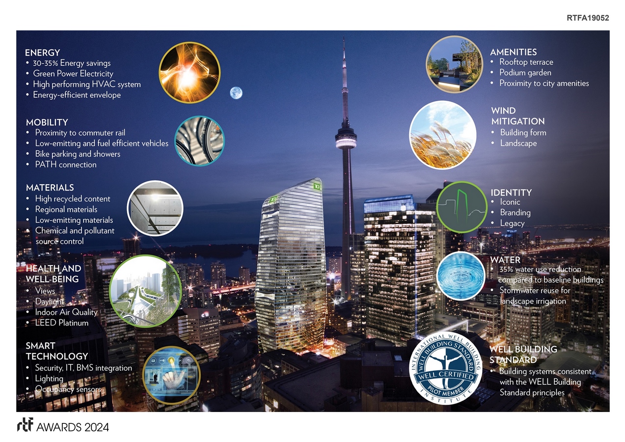 | Consultants: | Architect of Record: B+H Architects Mechanical / FP Engineering: Smith + Andersen Civil Engineering: R.V. Anderson Associates Limited Electrical Engineering: Mulvey & Banani International Inc. Vertical Transportation: KJA Consultants Inc. Wind Testing: Rowan Williams Davies & Irwin Inc Structural Engineering: Read Jones Christoffersen Ltd. Landscape Architect: Quinn Design Associates Inc. Facade Access: RDP Engineering Inc. LEED Consultant: Footprint Traffic Consultant: BA Consulting Group Ltd. |