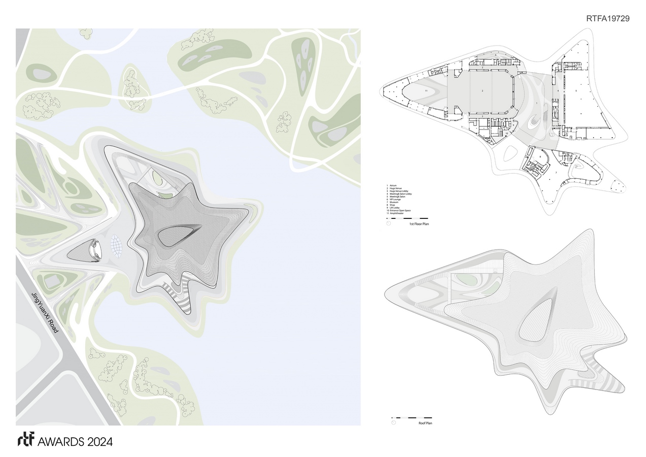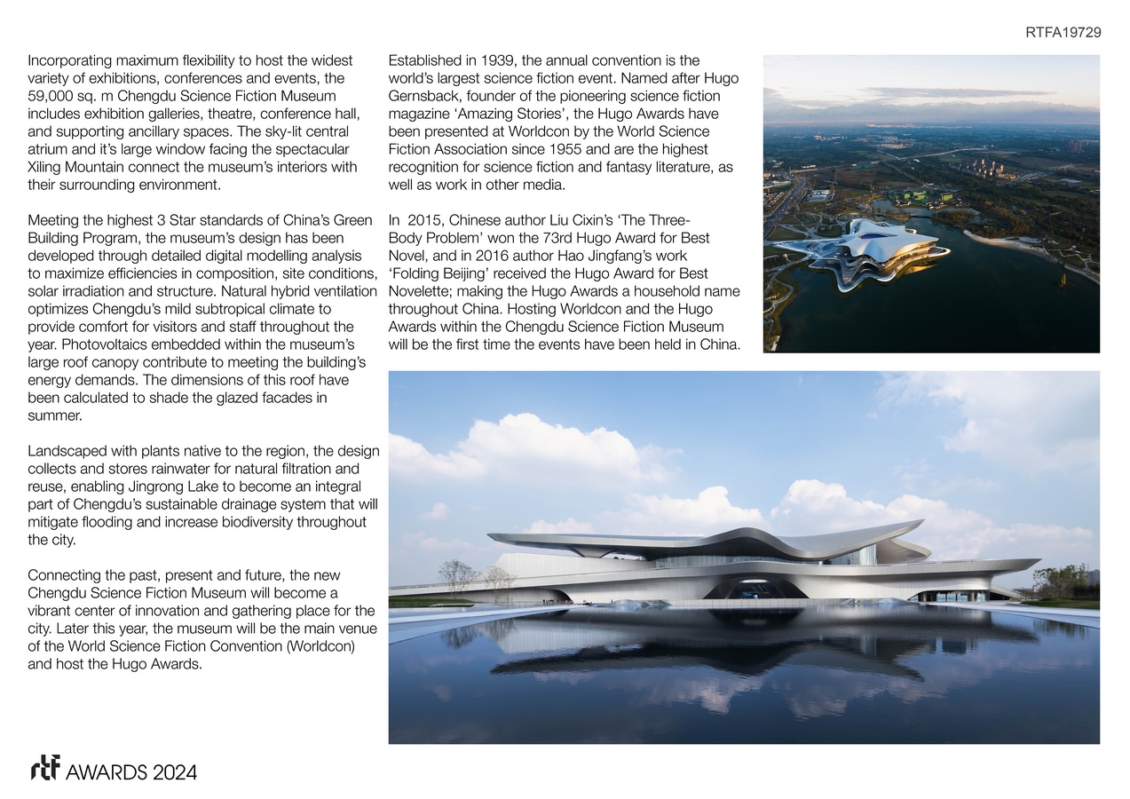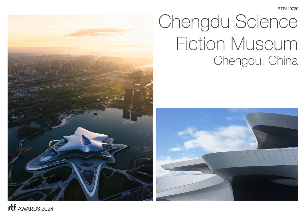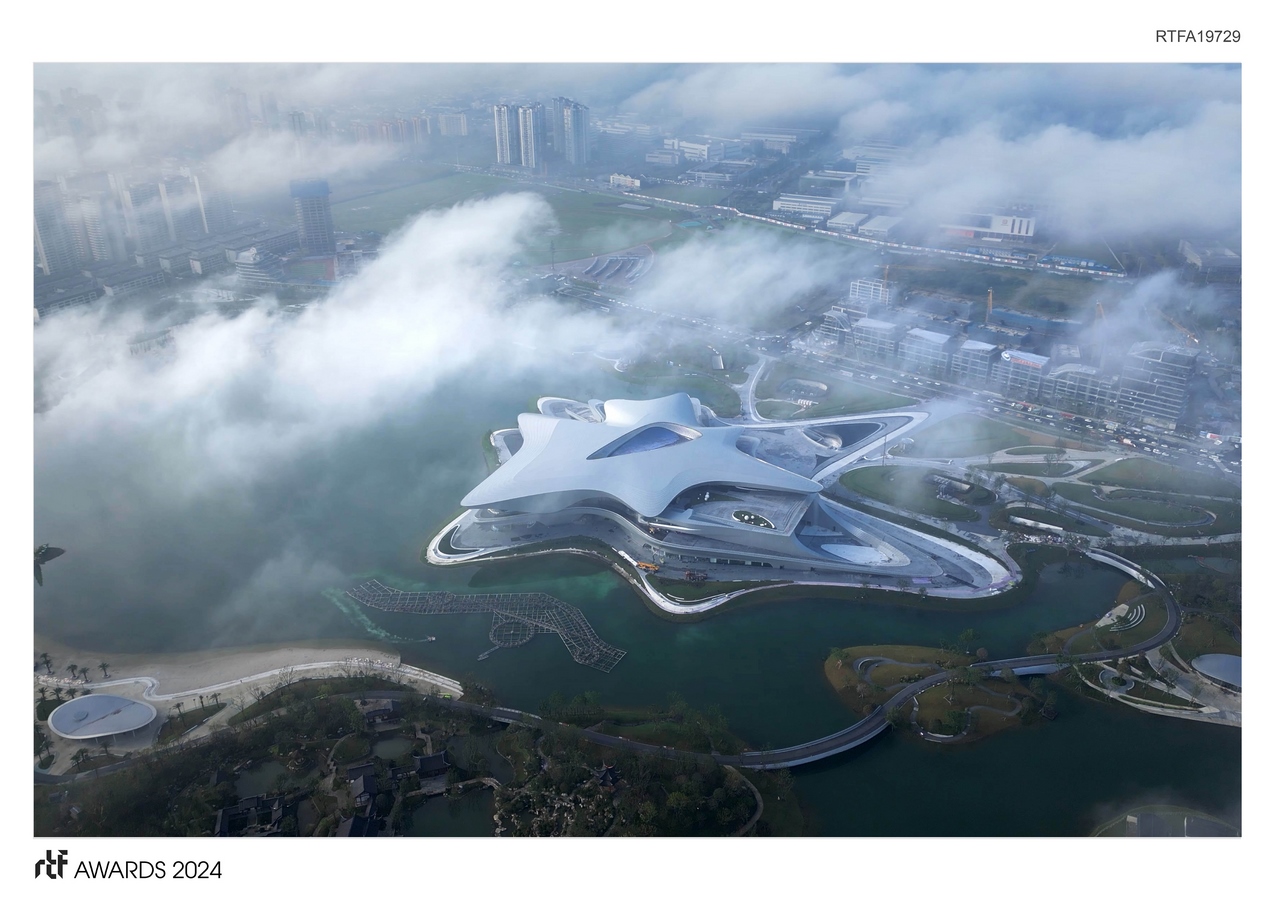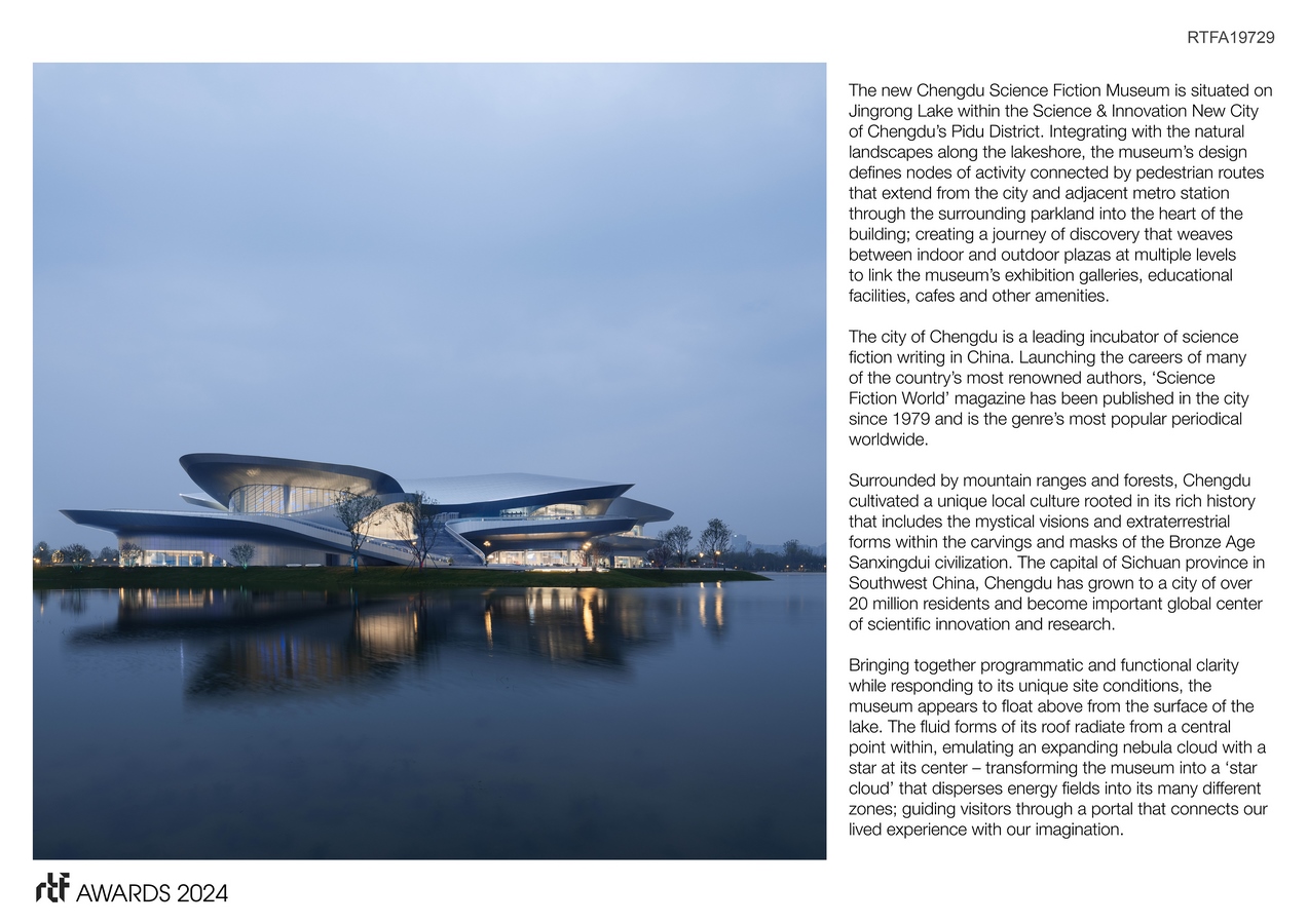 The Chengdu Science Fiction Museum is situated in the core area of Jingrong Lake within the Science & Innovation New City of Chengdu’s Pidu District. Integrating with the natural landscapes along the lakeshore, the museum’s design defines nodes of activity connected by pedestrian routes that extend from the city through the surrounding parkland into the heart of the building; creating a journey of discovery that weaves between indoor and outdoor plazas at multiple levels to link the museum’s exhibition galleries, educational facilities, cafes, and other amenities.
