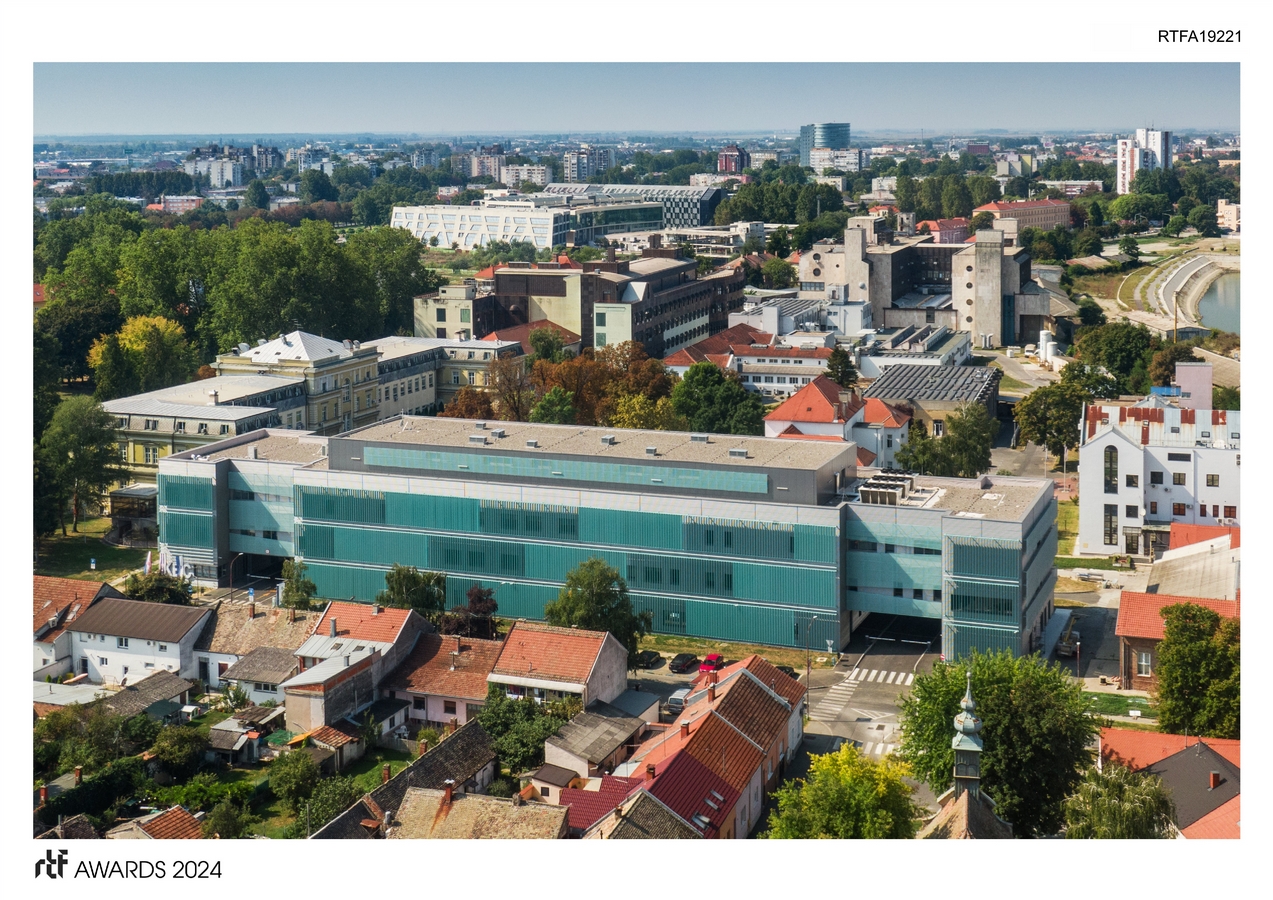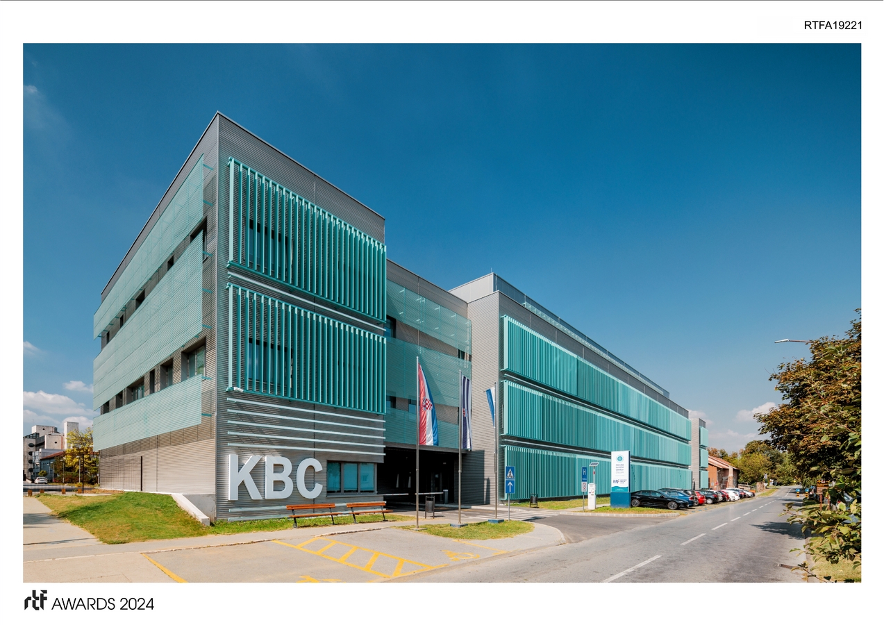 The location is on the eastern side of KBC Osijek, making the building a focal point in the area and the main entrance/exit to the hospital complex. Special attention was given to separating the communication routes for staff and patients. Each has their entrances, corridors, staircases, and elevators. Thus, the space is organized as follows: waiting area zone, patient communication zone, in the middle of the building, the outpatient/consultation zone, staff communication zone, and staff room zone. All of this was designed long before the time of COVID-19 when the importance of a building system with such communications, or in architectural jargon, a building with clean/dirty corridors, became particularly evident.