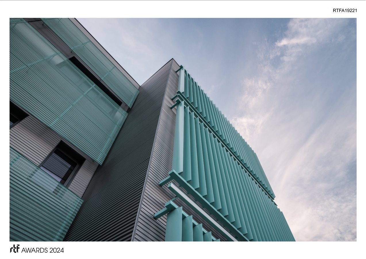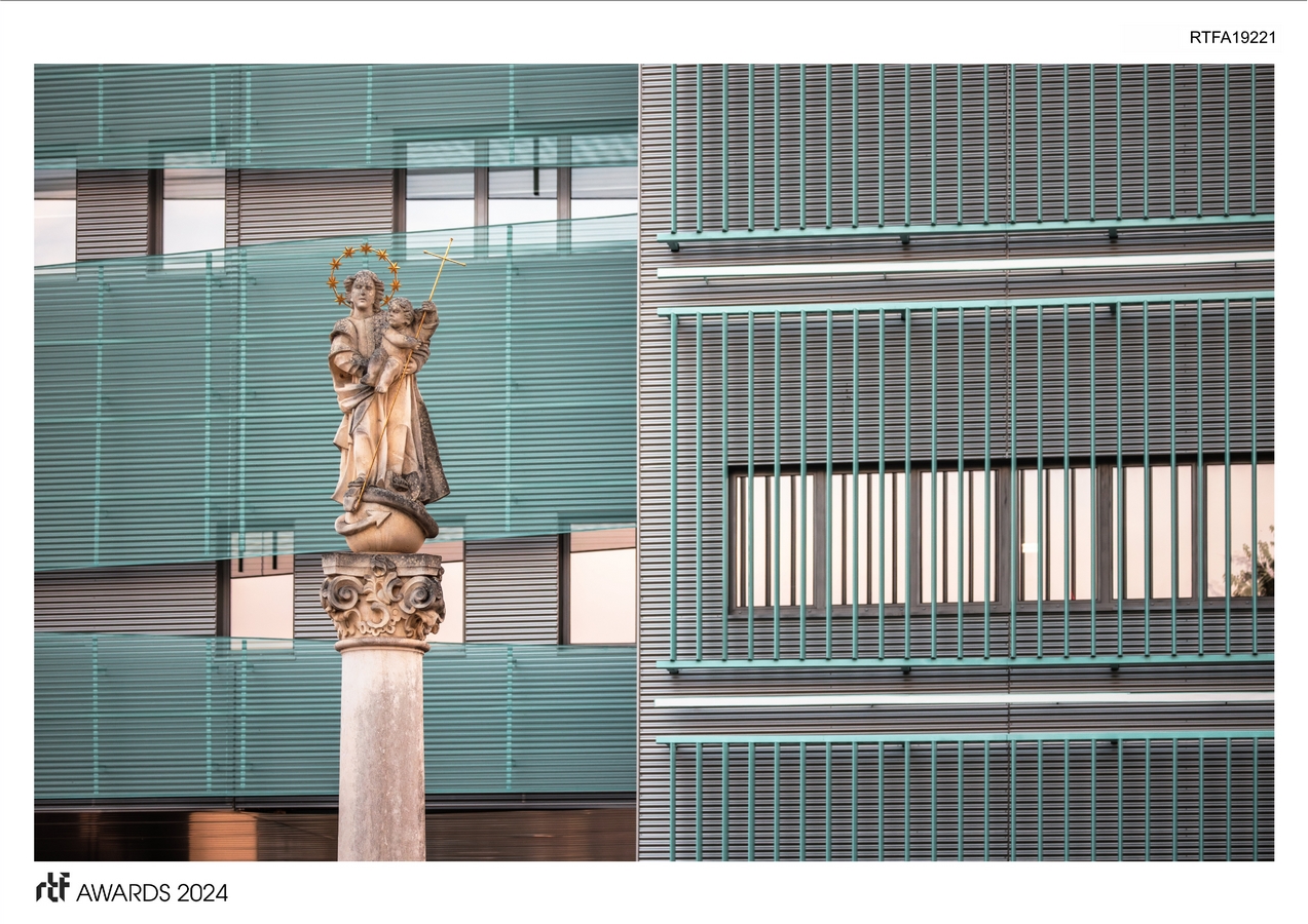 We also empathized with the patients, who come to such a building seeking help, and the space must be straightforward, readable, logical, easily memorable, but also not visually sterile to avoid further depression. For this reason, each floor has a different pleasant color to help patients navigate the space, remember where they have been, and feel a touch of optimism. The architectural gesture of external design in the form of vertical aluminum louvers serves a dual function, providing sun protection and serving as decorative elements.