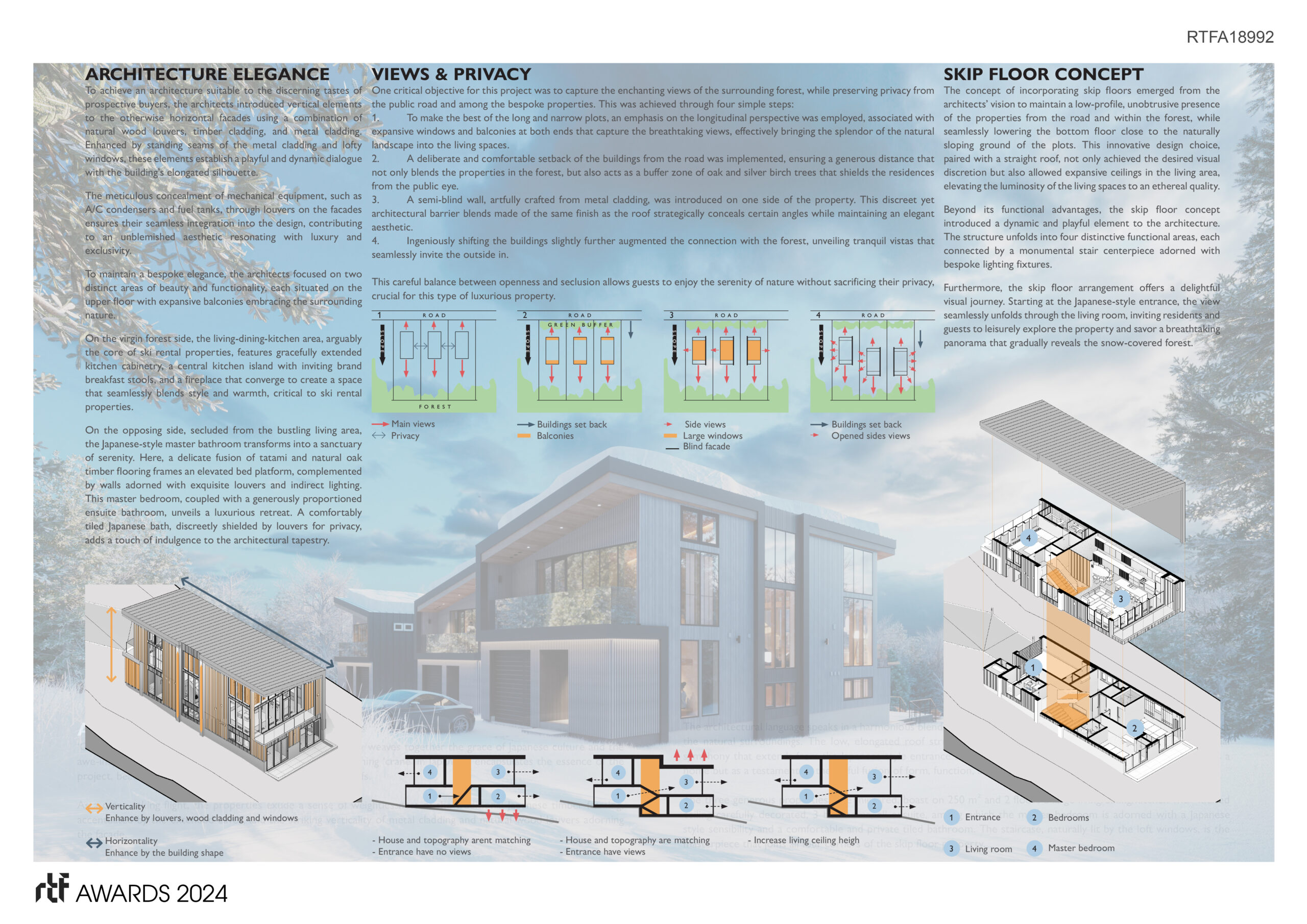 Inspired by Japanese culture and nature’s beauty, ‘Grand Tsuru’ is an architectural masterpiece. The name, meaning ‘crane’ in Japanese, symbolizes the project’s essence, reflected in the mirrored slopes of the roofs. The properties exude a sense of weightlessness reminiscent of traditional Japanese timber framing, accentuated by extended eaves and vertical metal cladding with natural wood louvers on the facade.