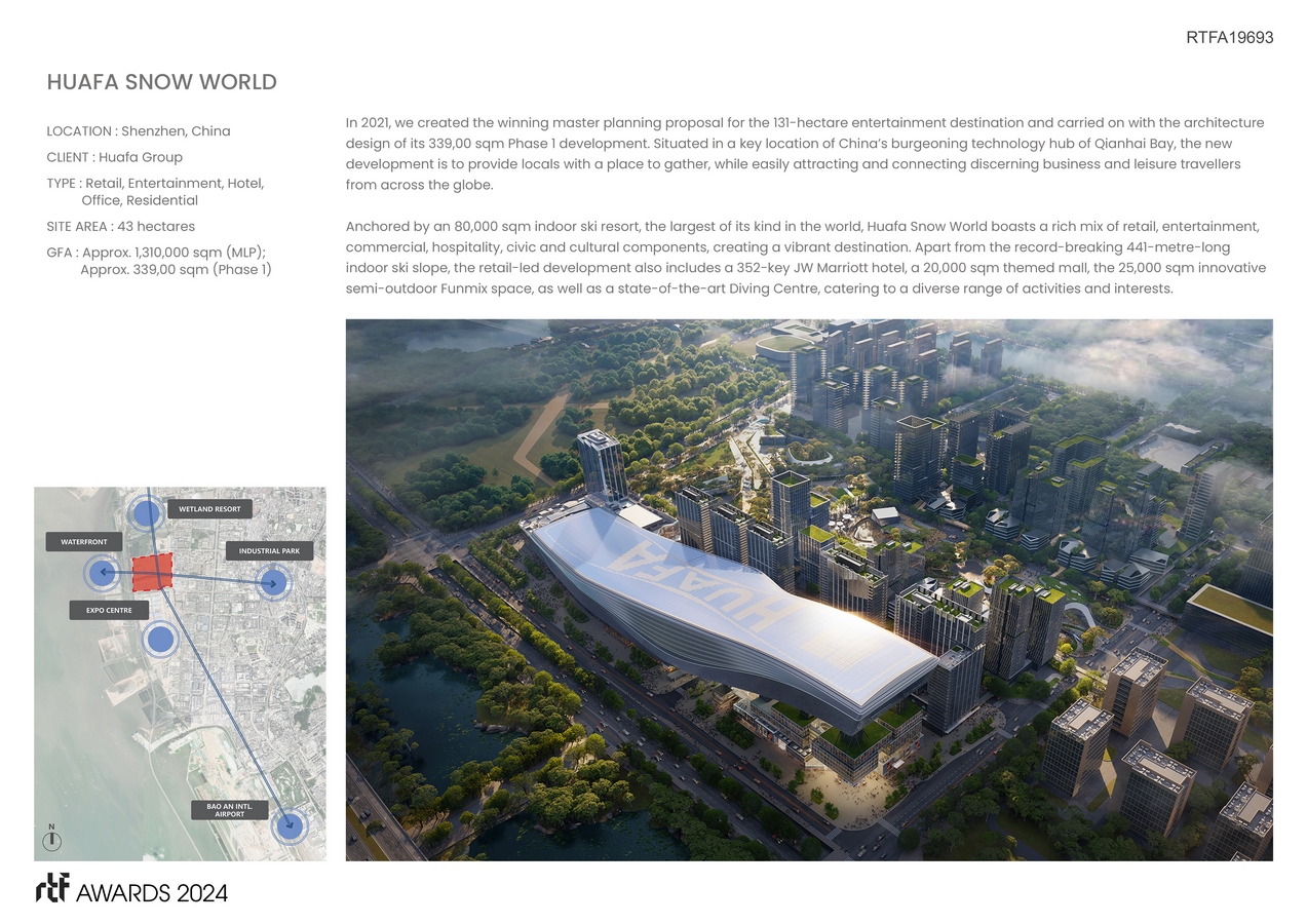 Huafa Snow World is a 131-hectare entertainment destination in Shenzhen, China. The visionary design solidifies its strategic position at the heart of the burgeoning tech hub, Qianhai Bay, in northwest Shenzhen.