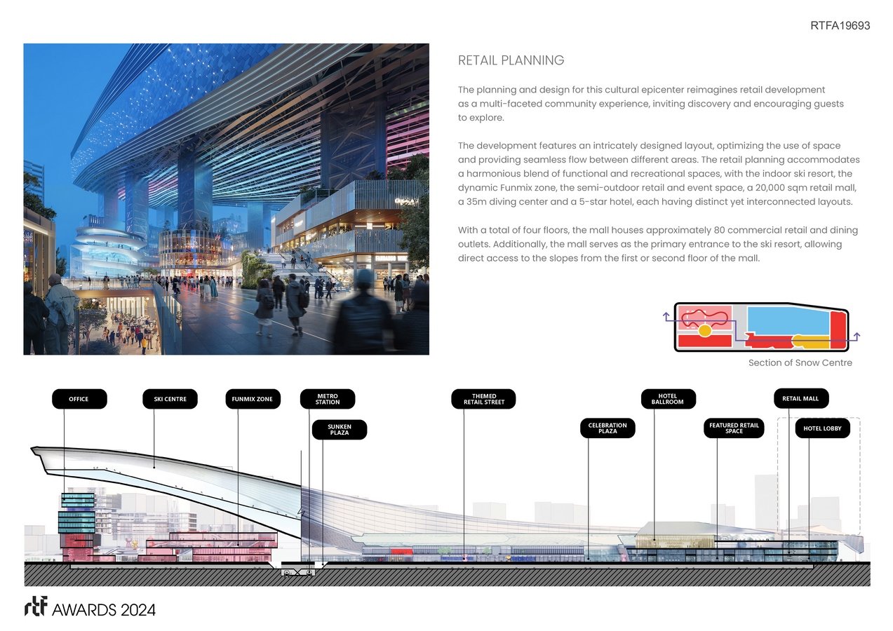 Anchored by an 80,000sqm indoor ski resort, the largest of its kind in the world, the project boasts a rich mix of retail, entertainment, commercial, hospitality, civic and cultural components, creating a vibrant destination servicing both tourists and local residents.