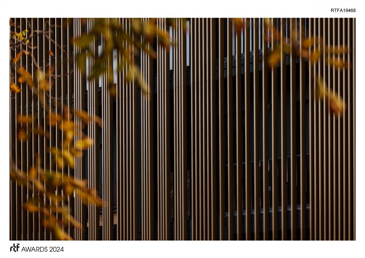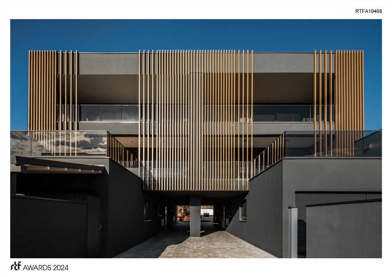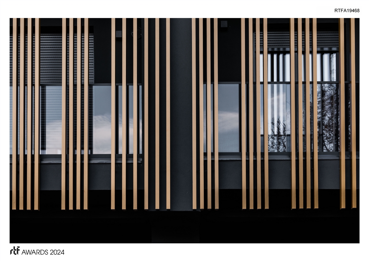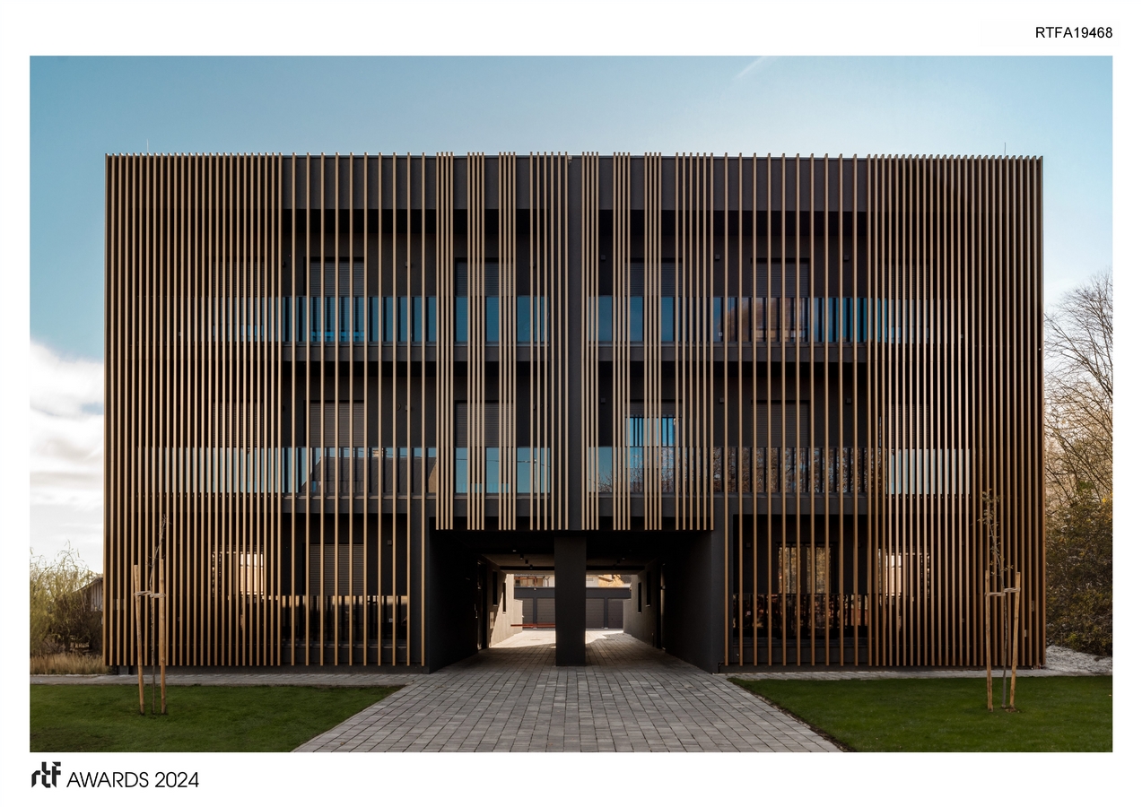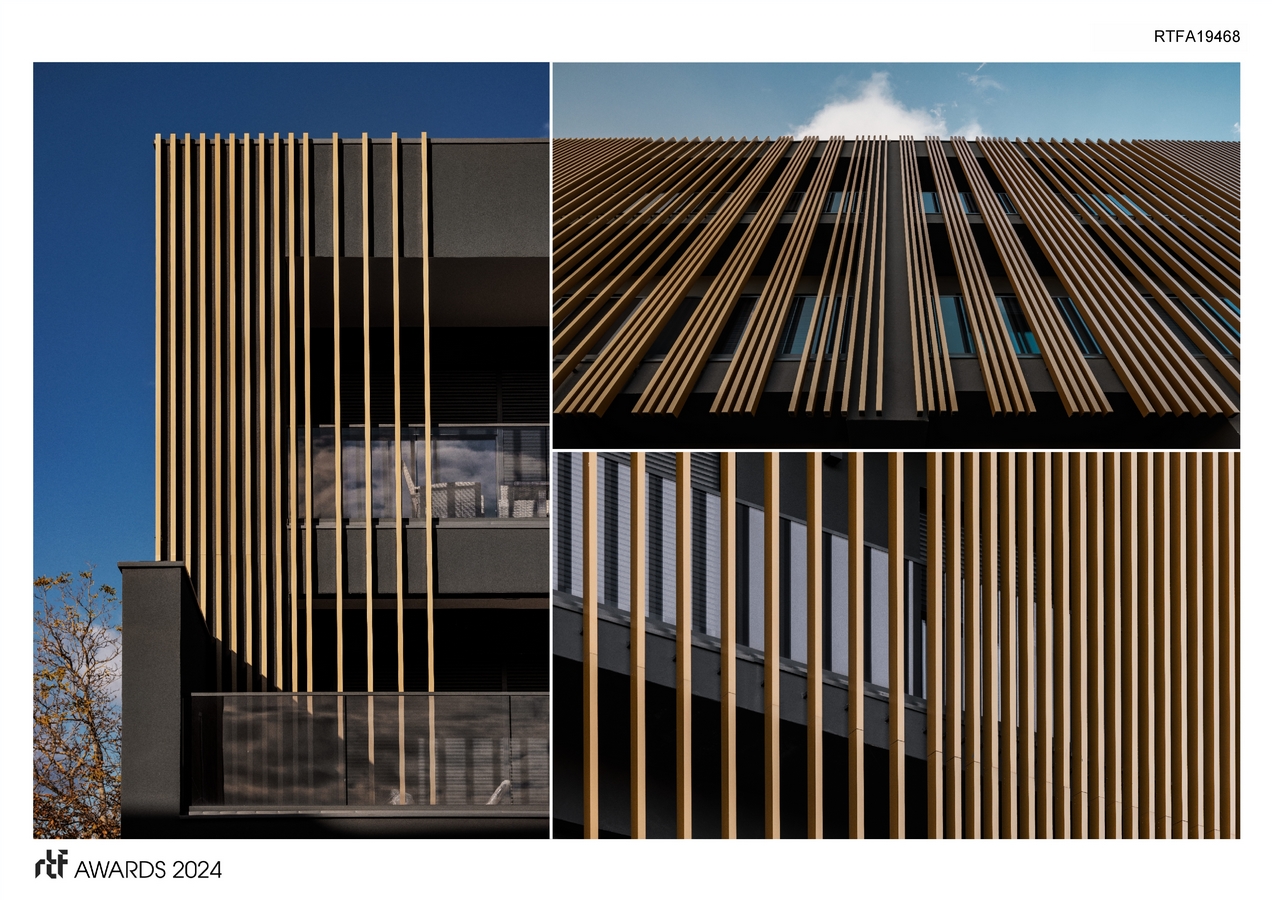 In addition to functional, comfortable, and excellently equipped apartments, what gives the building its distinctiveness is a special membrane made of aluminum pearl gold lamellas. It allows residents to see without being seen from the outside, yet to be seen because of the architecture with signature.