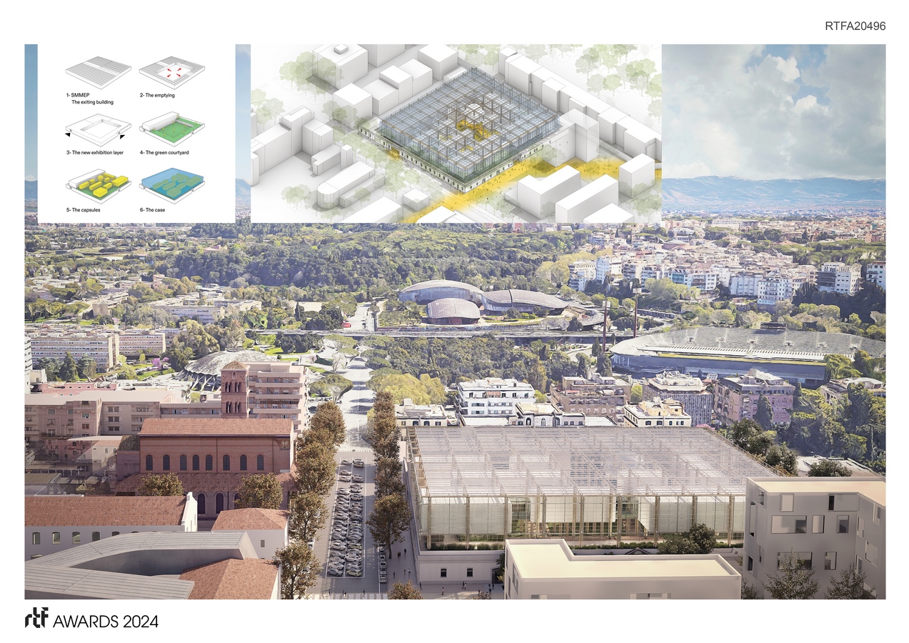 The complex blends into the urban fabric and future developments, connecting with neighbouring projects such as Flaminio Urban Project and the new MAXXI – Green MAXXI and MAXXI hub. The design preserves the existing walls of the SMMEP (Military Establishment of Precision Electronic Materials). At the same time, the interior of the building defines a new public urban park merging with the adjacent planned park area.