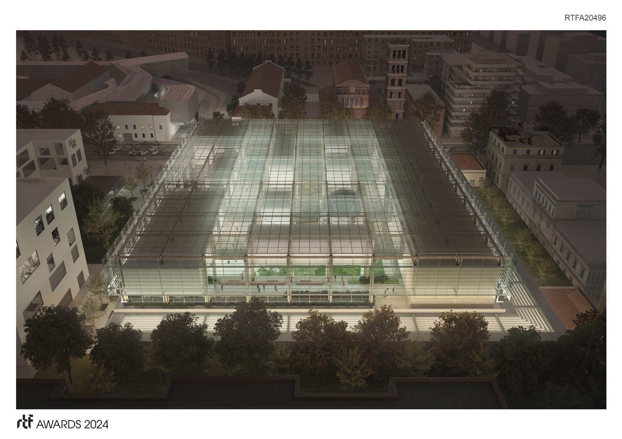 An on-demand gallery and areas for research and management support the new terrace, offering a buffer zone for open-air exhibitions that fades the threshold between the existing volume and the glass surface.