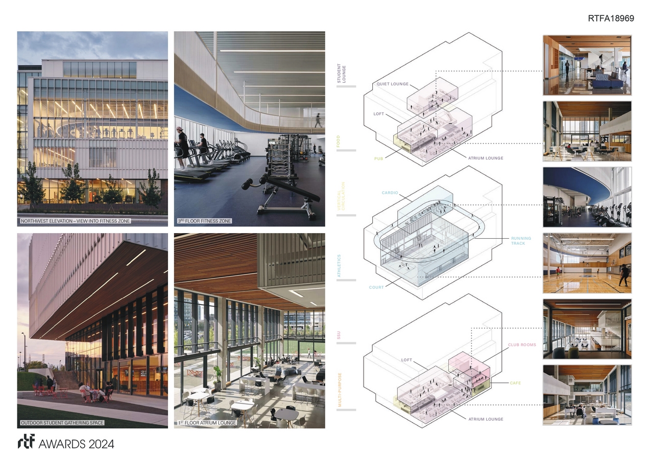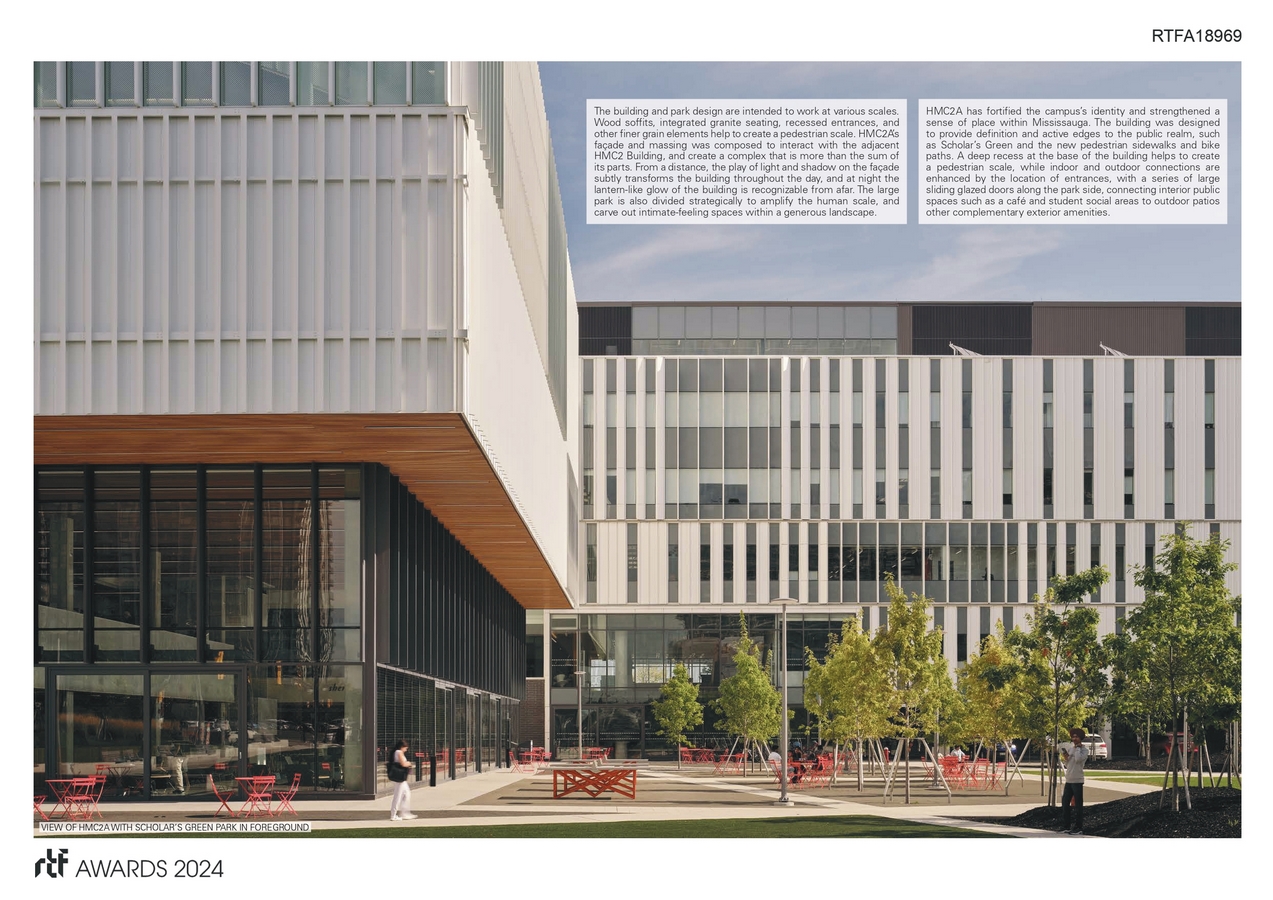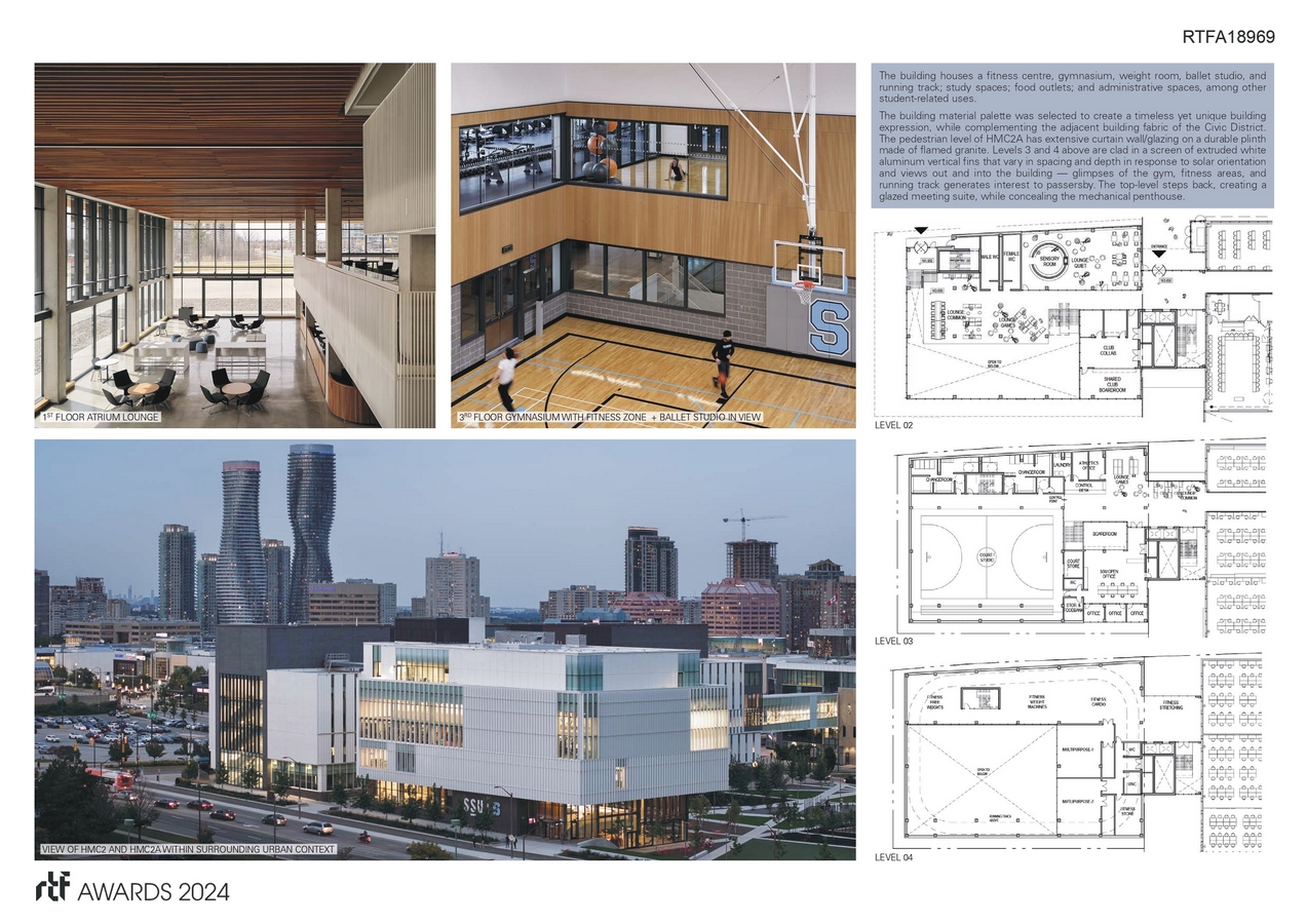 The building houses a fitness centre, gymnasium, and running track, as well as study spaces, food outlets, and administrative spaces. In designing this social and wellness centre, connections were maximized between large, open, multipurpose spaces and smaller, more defined program spaces, indoor amenities, and outdoor amenities. HMC2A is accessible via a main arterial to the north and the recently completed Scholarโs Green Park expansion to the south. Open and covered walkways, a patio, and outdoor turf field complement the graphic, angular design of the quad and encourage social activities inside the building to spill out onto school grounds. These quality outdoor spaces support the desire for intensification and animate the public realm while supporting a strong student community.