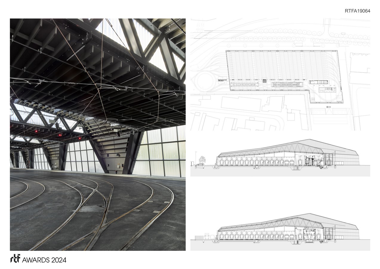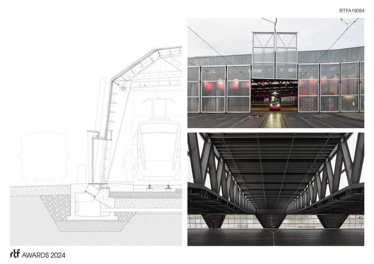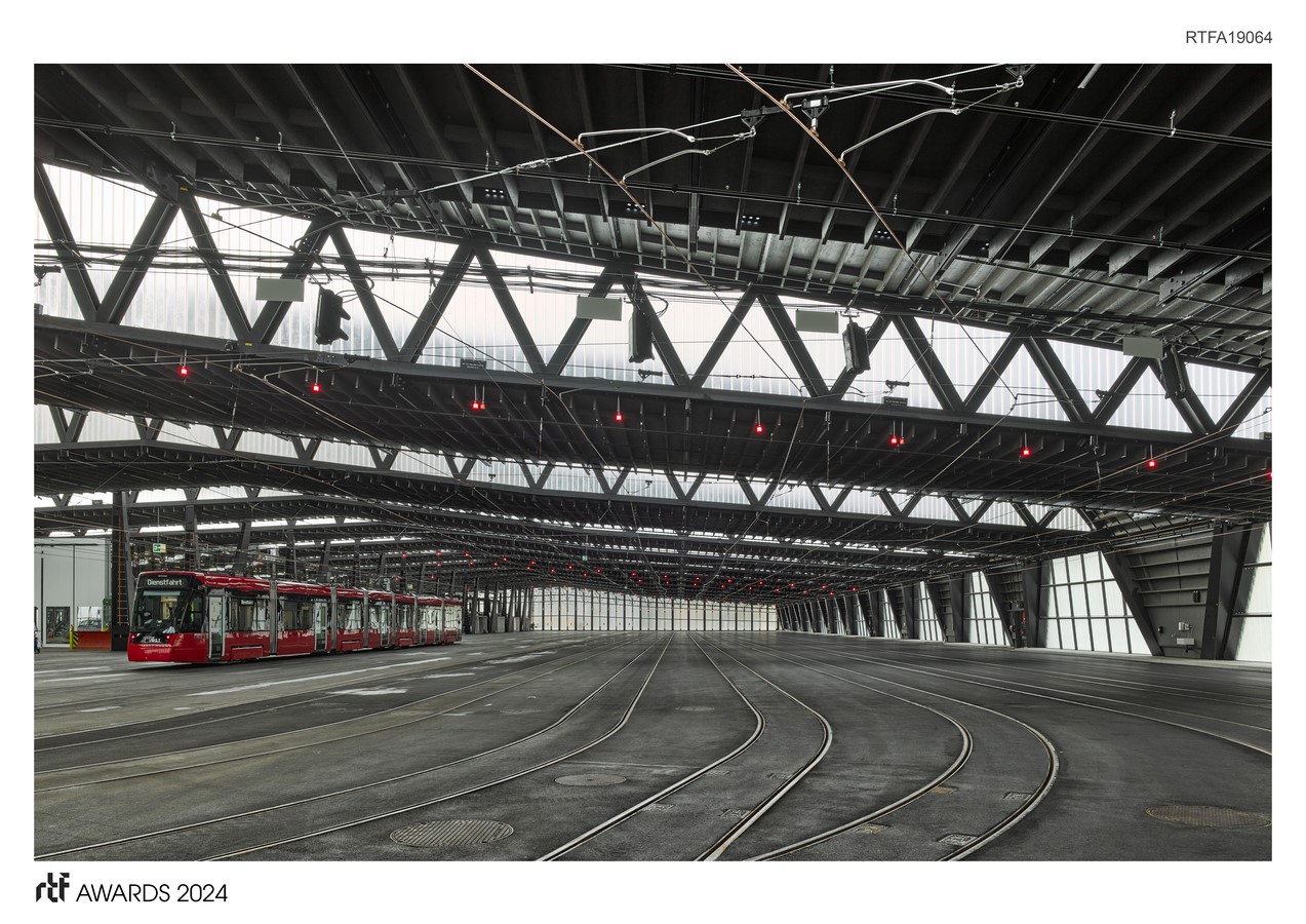 The external appearance of the hall is characterized by the lightness of the glass-aluminium shell. The red streetcars and signals shimmer dimly through the translucent faรงade cladding of the large hall. The supporting structure, composed of lines and struts, is spanned by a metallic-glass shell that gives the building a sculptural expression.